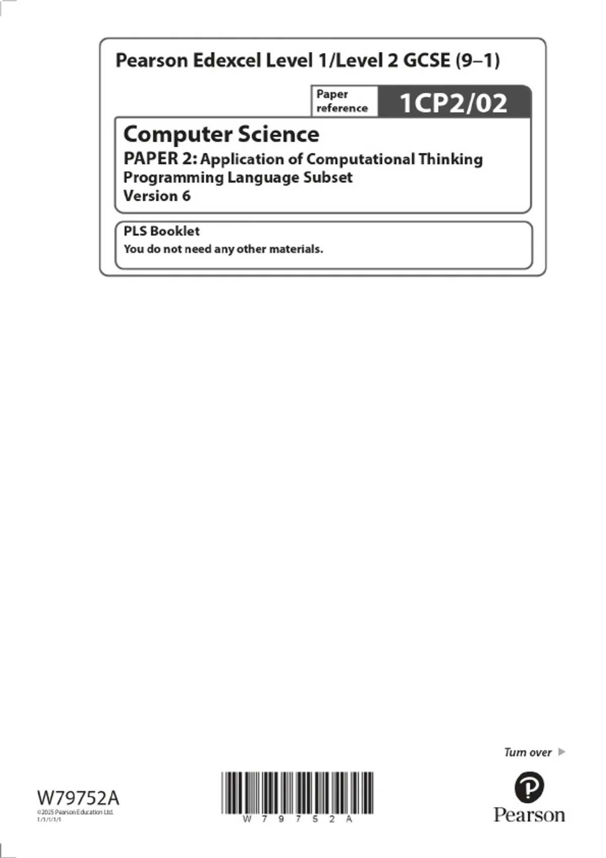 2025 Pearson Edexcel Level 1/Level 2 GCSE (9–1) Computer Science PAPER 2: Application of Computational Thinking Programming Language Subset Version 6 Combined Question Paper and Marking Scheme