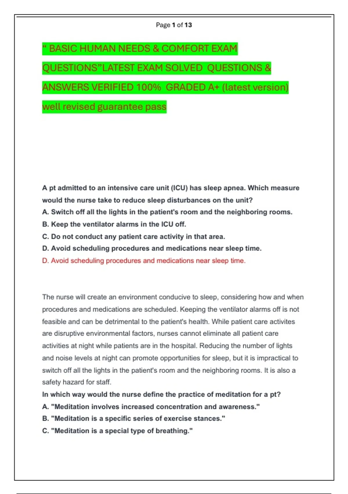 “ BASIC HUMAN NEEDS & COMFORT EXAM