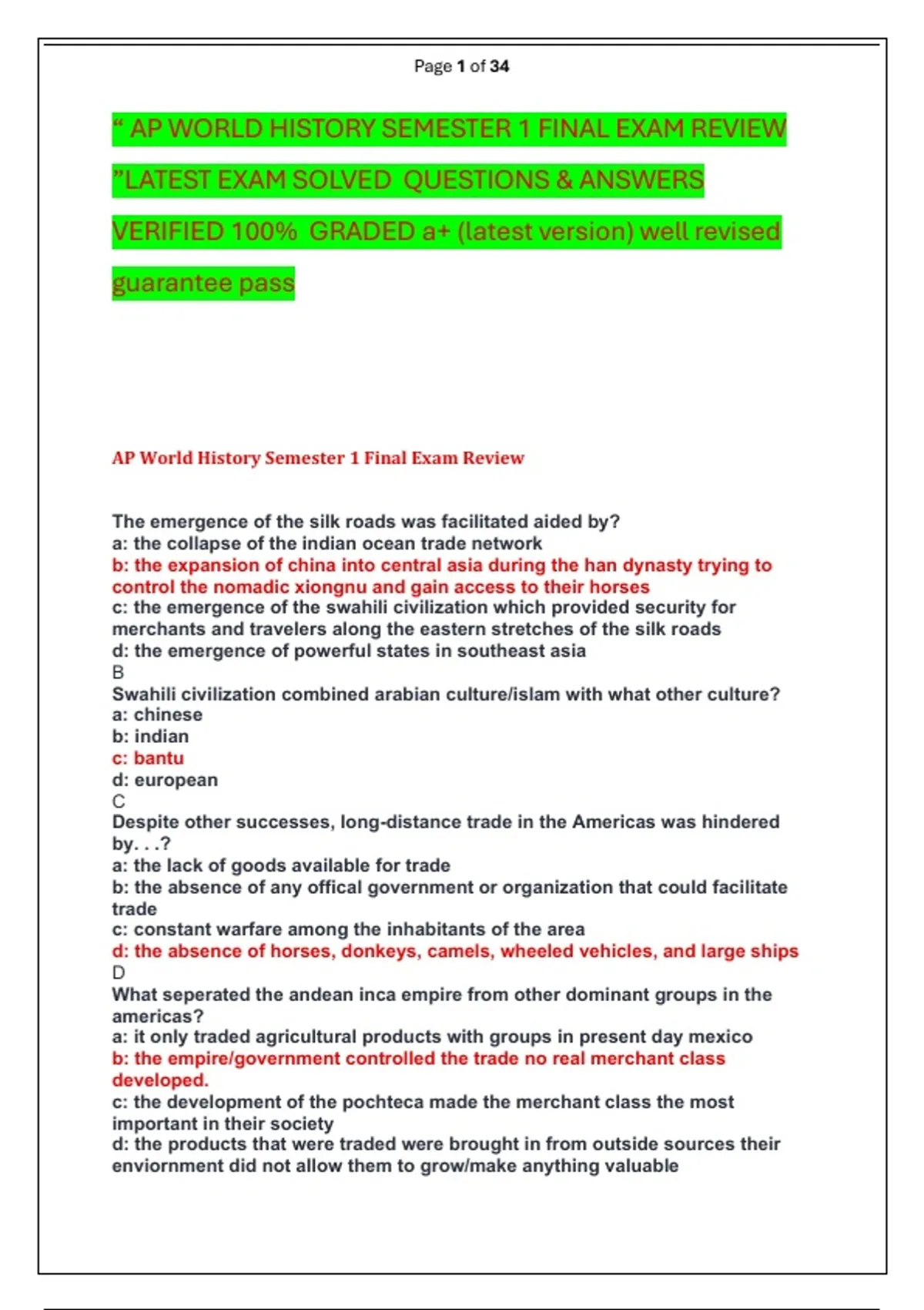 AP WORLD HISTORY SEMESTER 1 FINAL EXAM REVIEW ”LATEST EXAM SOLVED QUESTIONS & ANSWERS VERIFIED 100% GRADED a+ (latest version) well revised guarantee pass