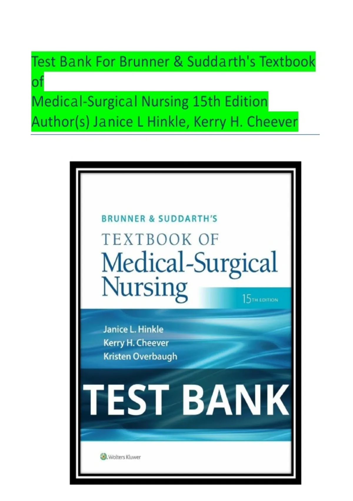 This complete Test Bank accompanies Brunner & Suddarth’s Textbook of Medical-Surgical Nursing, 15th Edition by Janice L. Hinkle & Kerry H. Cheever. It includes chapter-by-chapter questions with verified answers and rationales, covering adult health nursing, pathophysiology, clinical interventions, pharmacology, patient assessment, chronic and acute conditions, nursing care plans, and evidence-based clinical decision-making. Designed for nursing students, RN programs, and NCLEX exam preparation, this resource supports quizzes, midterms, finals, and comprehensive exam review, helping students master critical thinking, clinical reasoning, and medical-surgical nursing skills. Updated and labeled for 2026 academic use.
