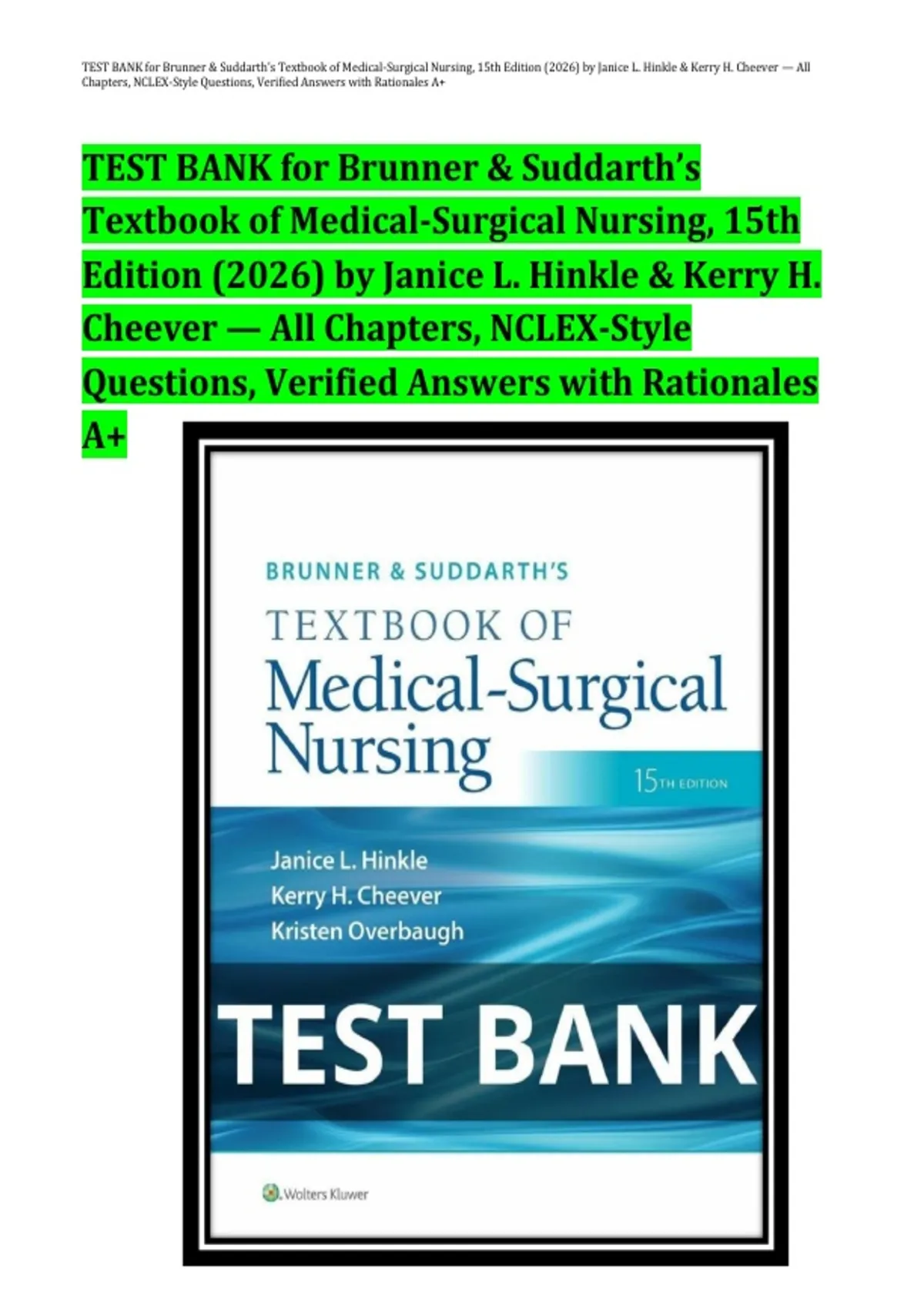 TEST BANK for Brunner & Suddarth’s Textbook of Medical-Surgical Nursing, 15th Edition (2026) by Janice L. Hinkle & Kerry H. Cheever — Complete Chapter Coverage, NCLEX-Style Questions, Verified Answers with Detailed Rationales A+