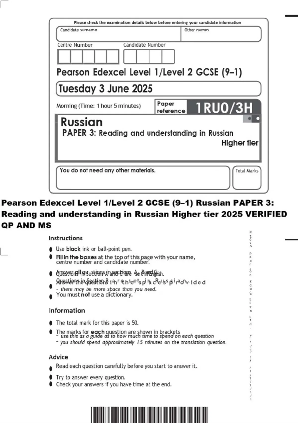 Pearson Edexcel Level 1/Level 2 GCSE (9–1) Russian PAPER 3: Reading and understanding in Russian Higher tier 2025 VERIFIED QP AND MS