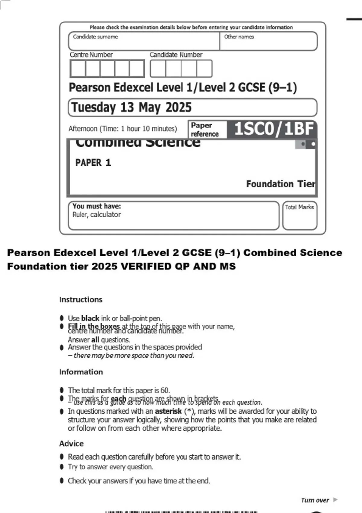 Pearson Edexcel Level 1/Level 2 GCSE (9–-1) Combined Science Foundation tier 2025 VERIFIED QP AND MS