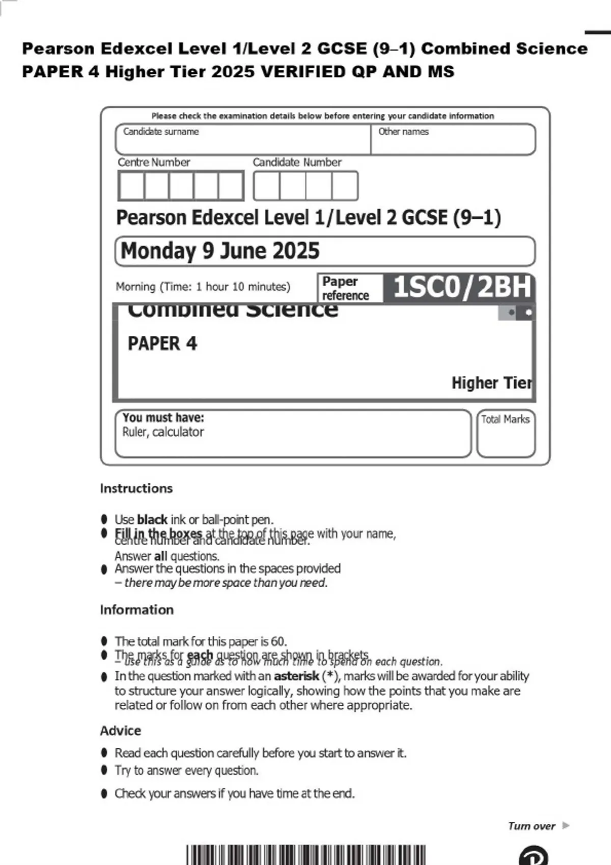 Pearson Edexcel Level 1/Level 2 GCSE (9–1) Combined Science PAPER 4 Higher Tier 2025 VERIFIED QP AND MS