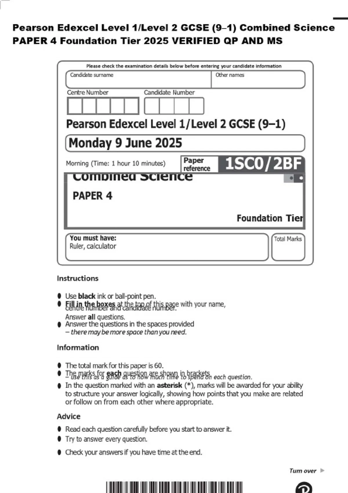 Pearson Edexcel Level 1/Level 2 GCSE (9–1) Combined Science PAPER 4 Foundation Tier 2025 VERIFIED QP AND MS