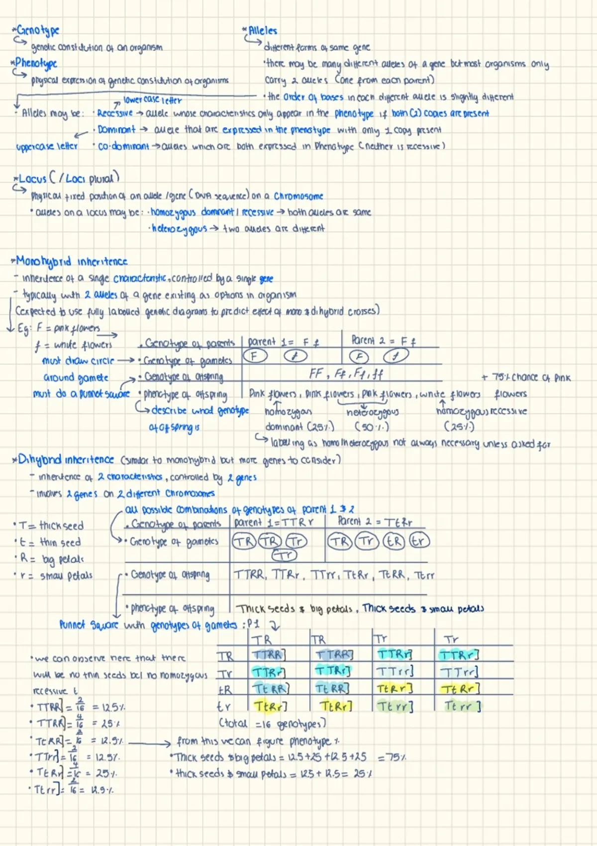 In depth explanation, covering all the specification requirements on what you need to know about Inheritance and Population. Includes definitions, explanations of how to use definitions, work examples of punnet squares for monohybrid and dihybrid crossing, an in depth labeled table of how to determine the genotypes of parents, genotypes of gametes, genotypes of offsprings, and phenotype of offsprings (including labels of heterozygous, homozygous, dominance, and recession), it also includes how to calculate frequency of phenotypes. Includes definitions of Co-dominance, more information on co-dominance, how to determine co-dominance. Includes definition of sex-linkage, in depth information on what sex-linkage is, a labelled sex-linkage punnet square with a spec-required example. Definition of autosomal linkage, in depth explanation of autosomal linkage, and a worked example of autosomal linkage. Definition of epistasis, in depth information on epistasis, and a very detailed, labeled flow chart of how epistasis works. A definition of the Chi-squared test, in depth working out of the chi-squared test, the formula, degrees of freedom definition, information on observed phenotypic ratios with expected ratios, examples, definitions, and in depth explanations of null hypothesis. In depth information and explanations as well as definition of population genetics, gene pools, species, etc (all spec points met and explained.) A definition and worked in depth example (and information) on the hardy-weinberg principle (and equation, as well as how to use it). Explanation of how to work out frequencies (of alleles and individuals). Discusses all the assumptions of the hardy-weinberg equation/principle in points. A numbered step-by-step example and explanation of how to use the hardy-weinberg equation. The document is the equivalent of 6 A4 Papers of normal handwriting (this document was made on an Ipad so that you can scroll through and zoom in at ease.)