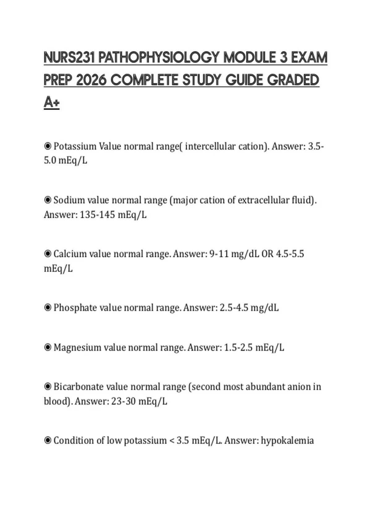 ◉ Potassium Value normal range( intercellular cation). Answer: 3.5-