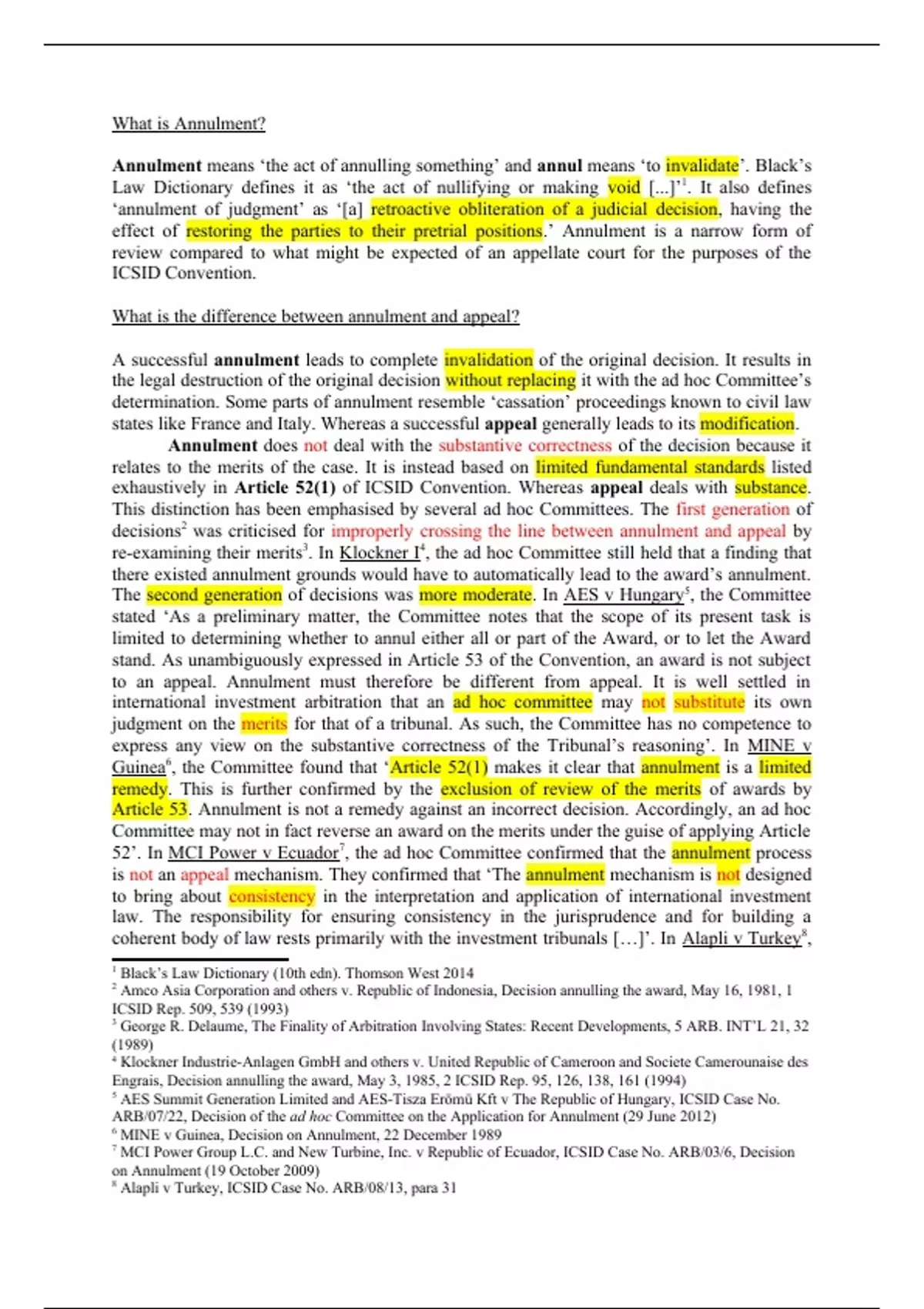 Annulment Annulment vs Appeal Annulment as Discretionary Remedy Development of Annulment Scope of Annulment o Decisions not subject to annulment o Decisions subject to annulment o Annulment of parts of the award o Parties’ waiver of the right of annulment Procedure o Time limits o Formal requirements o Registration of the annulment application o Constitution of the Ad Hoc Committee o Procedural rules applicable to annulment proceedings Stay o Provisional stay o Request for stay before Ad Hoc Committee o Ad Hoc Committee’s decision o Modification/Termination Effects o Resubmission of the dispute to a new tribunal o ‘Domino effect’ of partial annulment o Partial annulment & Res judicata Grounds o Improper constitution of the tribunal o Manifest excess of the tribunal’s powers o Corruption on the tribunal’s part o Serious departure from a fundamental rule of procedure o Failure to state reasons  - Absence of reasons  - Insufficient/Inadequate reasons  - Contradictory reasons  - Failure to deal with every question