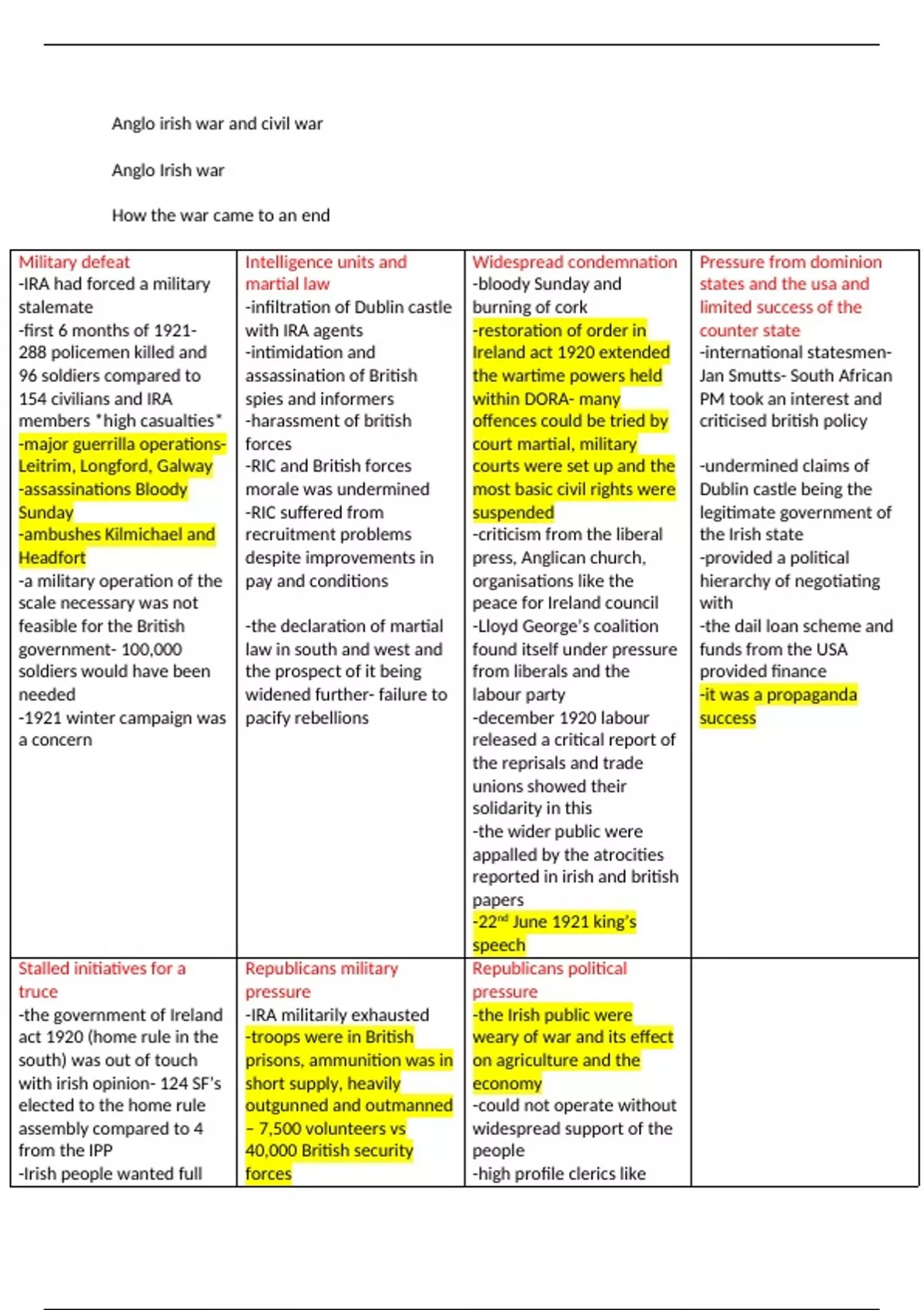 stalemate -infiltration of Dublin castle burning of cork limited success of the