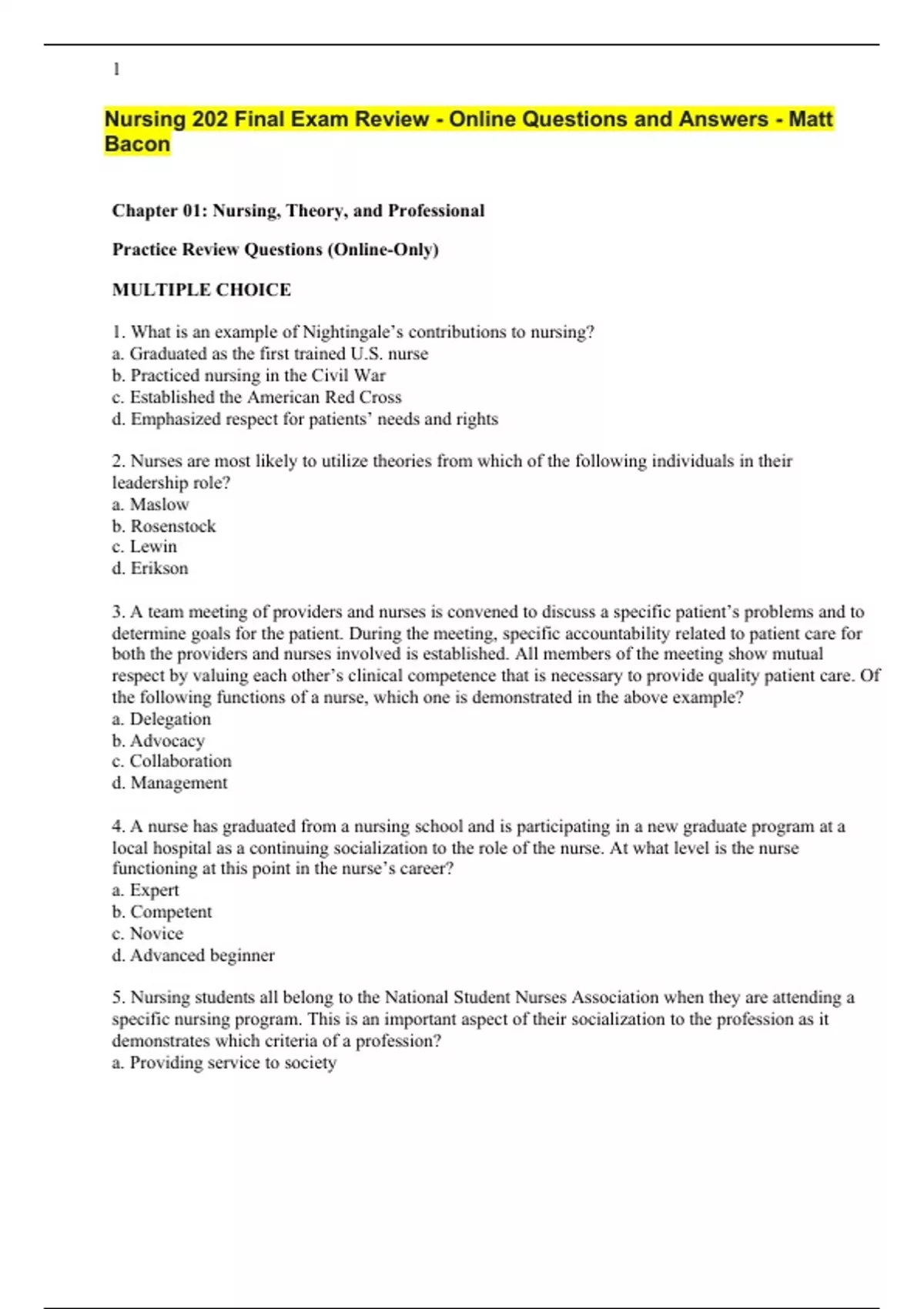 nursing 202 Final Exam Review - Online Questions and Answers - Matt Bacon Chapter 01: Nursing, Theory, and Professional Practice Review Questions (Online-Only) MULTIPLE CHOICE 1. What is an example of Nightingale’s contributions to nursing? a. Graduated as the first trained U.S. nurse b. Practiced nursing in the Civil War c. Established the American Red Cross d. Emphasized respect for patients’ needs and rights 2. Nurses are most likely to utilize theories from which of the following individuals in their leadership role? a. Maslow b. Rosenstock c. Lewin d. Erikson 3. A team meeting of providers and nurses is convened to discuss a specific patient’s problems and to determine goals for the patient. During the meeting, specific accountability related to patient care for both the providers and nurses involved is established. All members of the meeting show mutual respect by valuing each other’s clinical competence that is necessary to provide quality patient care. Of the following functions of a nurse, which one is demonstrated in the above example? a. Delegation b. Advocacy c. Collaboration d. Management 4. A nurse has graduated from a nursing school and is participating in a new graduate program at a local hospital as a continuing socialization to the role of the nurse. At what level is the nurse functioning at this point in the nurse’s career? a. Expert b. Competent c. Novice d. Advanced beginner 5. Nursing students all belong to the National Student Nurses Association when they are attending a specific nursing program. This is an important aspect of their socialization to the profession as it demonstrates which criteria of a profession? a. Providing service to society