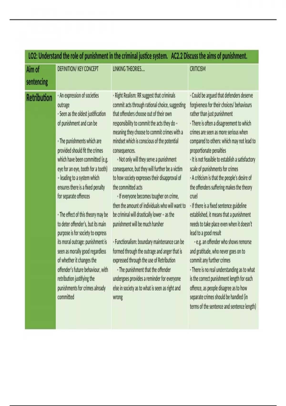 , LO2: Understand the role of punishment in the criminal justice system. AC2.2 Discuss the aims of punishment.