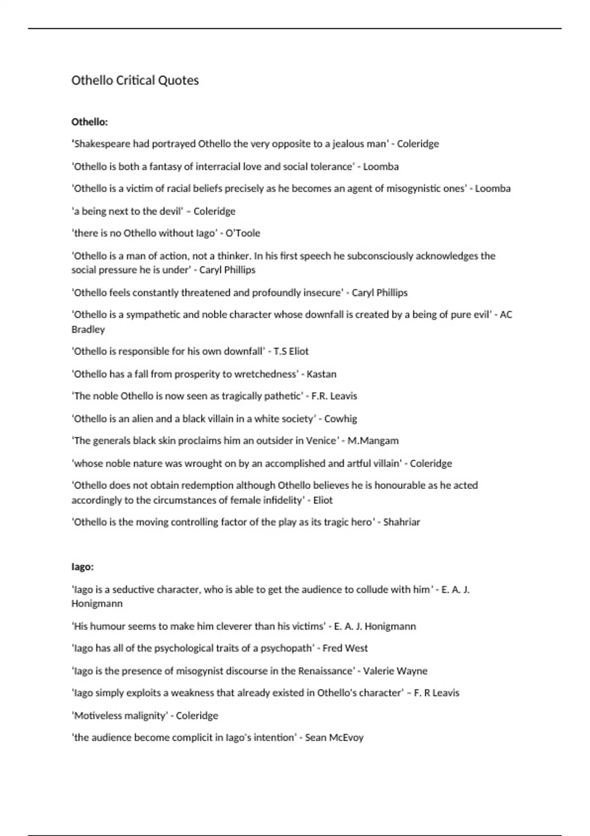 Othello Critical Quotes