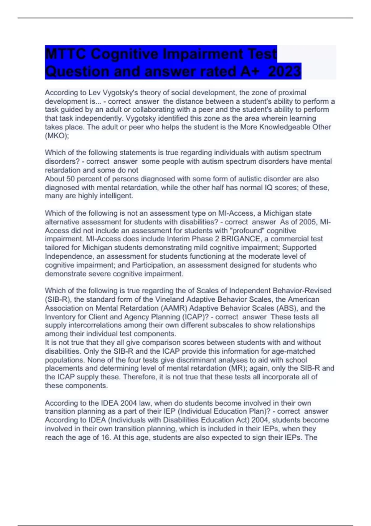 MTTC Cognitive Impairment Test Question and answer rated A+ 2023According to Lev Vygotsky's theory of social development, the zone of proximal development is... the distance between a student's ability to perform a task guided by an adult or collaborating with a peer and the student's ability to perform that task independently. Vygotsky identified this zone as the area wherein learning takes place. The adult or peer who helps the student is the More Knowledgeable Other (MKO); Which of the following statements is true regarding individuals with autism spectrum disorders? some people with autism spectrum disorders have mental retardation and some do not About 50 percent of persons diagnosed with some form of autistic disorder are also diagnosed with mental retardation, while the other half has normal IQ scores; of these, many are highly intelligent. Which of the following is not an assessment type on MI-Access, a Michigan state alternative assessment for students with disabilities? As of 2005, MI-Access did not include an assessment for students with "profound" cognitive impairment. MI-Access does include Interim Phase 2 BRIGANCE, a commercial test tailored for Michigan students demonstrating mild cognitive impairment; Supported Independence, an assessment for students functioning at the moderate level of cognitive impairment; and Participation, an assessment designed for students who demonstrate severe cognitive impairment. Which of the following is true regarding the of Scales of Independent Behavior-Revised (SIB-R), the standard form of the Vineland Adaptive Behavior Scales, the American Association on Mental Retardation (AAMR) Adaptive Behavior Scales (ABS), and the Inventory for Client and Agency Planning (ICAP)? These tests all supply intercorrelations among their own different subscales to show relationships among their individual test components. It is not true that they all give comparison scores between students with and without disabilities. Only the SIB-R and the ICAP provide this information for age-matched populations. None of the four tests give discriminant analyses to aid with school placements and determining level of mental retardation (MR); again, only the SIB-R and the ICAP supply these. Therefore, it is not true that these tests all incorporate all of these components. According to the IDEA 2004 law, when do students become involved in their own transition planning as a part of their IEP (Individual Education Plan)? According to IDEA (Individuals with Disabilities Education Act) 2004, students become involved in their own transition planning, which is included in their IEPs, when they reach the age of 16. At this age, students are also expected to sign their IEPs. The 1994 IDEA mandated beginning transition planning when the student reached the age of 14, but this was changed in the newer version of the law. Educators, parents, and students are still encouraged to begin transition planning when the student is 14, as it can take several years with some students, but it is not legally required until the student is 16. # 1 Example of a 36 month old child showing language delay B. 36 month old child has an oral expression vocab of 20 words and does not combine words in her speech # 2 A third grade autistic student will most likely show difficulty with the following task A. working cooperatively with other students on class projects # 3 a leading prenatal cause of cognitive impairments is C. exposure to substance abuse # 4 teaching mild to moderate c.i. students to cross the street with these steps (stop, look, listen, walk) is successful if D. students practice as often as possible in the actual setting where they will use these steps # 5 in a standardized adaptive behavior assessment of a student with c.i., normative data should be used to provide which type of information A. a comparison of student's conceptual, social and practical abilities with those of students without cognitive impairments # 6 when interviewing parents of a student demonstrating difficulties in all academic areas and demonstrates inappropriate social behaviors which of the following questions would provide the most useful information to the teacher? A. when did you first notice student using language to communicate his needs B. what kind of toys does he play with C. does he follow a routine at home D. is he involved in community activities A. when did you first notice the student using language to communicate his needs