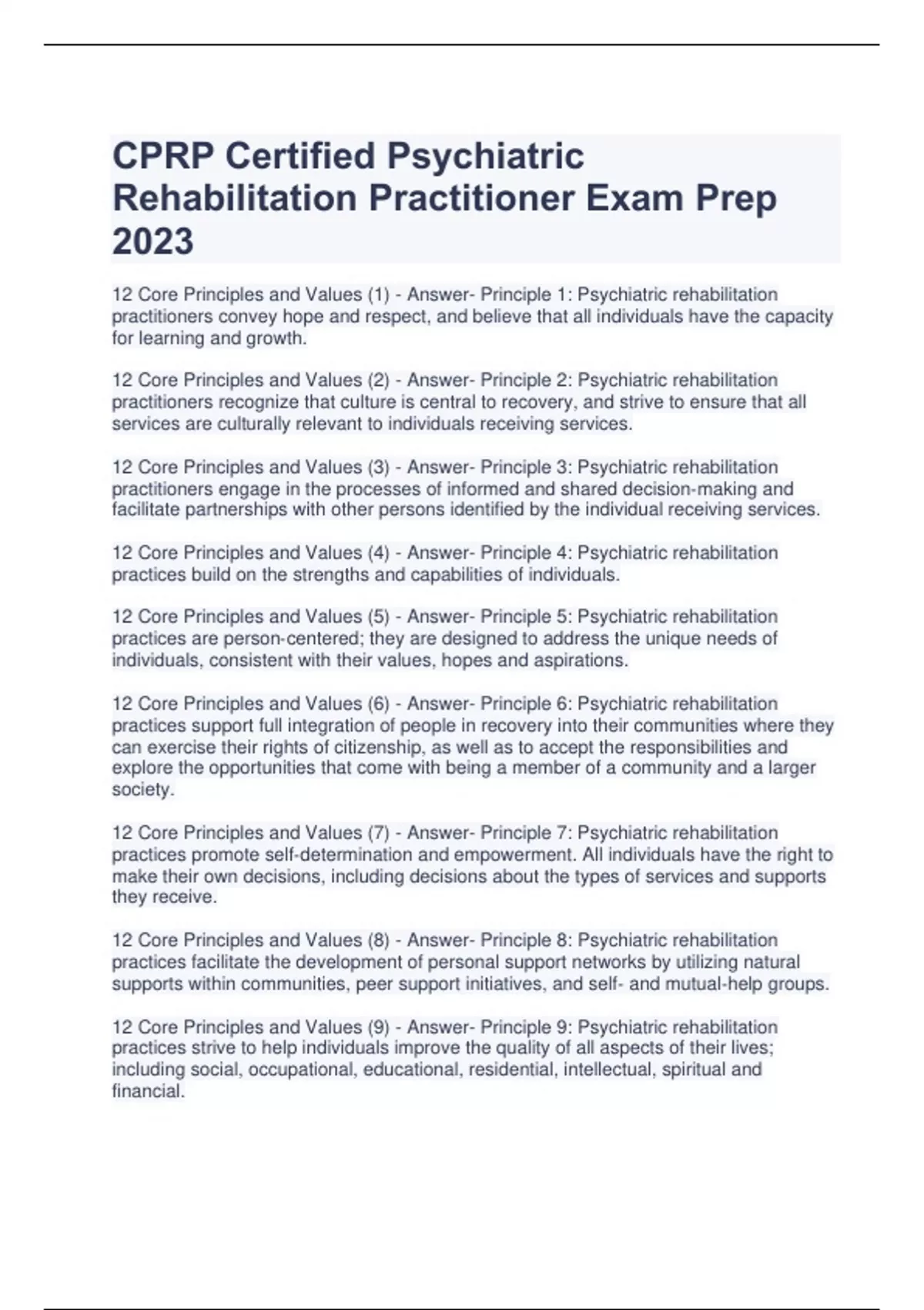 12 Core Principles and Values (1) - Answer- Principle 1: Psychiatric rehabilitation practitioners convey hope and respect, and believe that all individuals have the capacity for learning and growth. 12 Core Principles and Values (2) - Answer- Principle 2: Psychiatric rehabilitation practitioners recognize that culture is central to recovery, and strive to ensure that all services are culturally relevant to individuals receiving services. 12 Core Principles and Values (3) - Answer- Principle 3: Psychiatric rehabilitation practitioners engage in the processes of informed and shared decision‐making and facilitate partnerships with other persons identified by the individual receiving services. 12 Core Principles and Values (4) - Answer- Principle 4: Psychiatric rehabilitation practices build on the strengths and capabilities of individuals. 12 Core Principles and Values (5) - Answer- Principle 5: Psychiatric rehabilitation practices are person‐centered; they are designed to address the unique needs of individuals, consistent with their values, hopes and aspirations. 12 Core Principles and Values (6) - Answer- Principle 6: Psychiatric rehabilitation practices support full integration of people in recovery into their communities where they can exercise their rights of citizenship, as well as to accept the responsibilities and explore the opportunities that come with being a member of a community and a larger society. 12 Core Principles and Values (7) - Answer- Principle 7: Psychiatric rehabilitation practices promote self‐determination and empowerment. All individuals have the right to make their own decisions, including decisions about the types of services and supports they receive. 12 Core Principles and Values (8) - Answer- Principle 8: Psychiatric rehabilitation practices facilitate the development of personal support networks by utilizing natural supports within communities, peer support initiatives, and self‐ and mutual‐help groups. 12 Core Principles and Values (9) - Answer- Principle 9: Psychiatric rehabilitation practices strive to help individuals improve the quality of all aspects of their lives; including social, occupational, educational, residential, intellectual, spiritual and financial. 12 Core Principles and Values (10) - Answer- Principle 10: Psychiatric rehabilitation practices promote health and wellness, encouraging individuals to develop and use individualized wellness plans. 12 Core Principles and Values (11) - Answer- Principle 11: Psychiatric rehabilitation services emphasize evidence‐based, promising, and emerging best practices that produce outcomes congruent with personal recovery. Programs include structured program evaluation and quality improvement mechanisms that actively involve persons receiving services. 12 Core Principles and Values (12) - Answer- Principle 12: Psychiatric rehabilitation services must be readily accessible to all individuals whenever they need them. These services also should be well coordinated and integrated with other psychiatric, medical, and holistic treatments and practices. Priniciples 1 - 3 Focus - Answer- Focus on the role of practitioners Principles 4 - 10 Focus - Answer- Focus on best practices in the field Principles 11 - 12 - Answer- Focus on psychiat