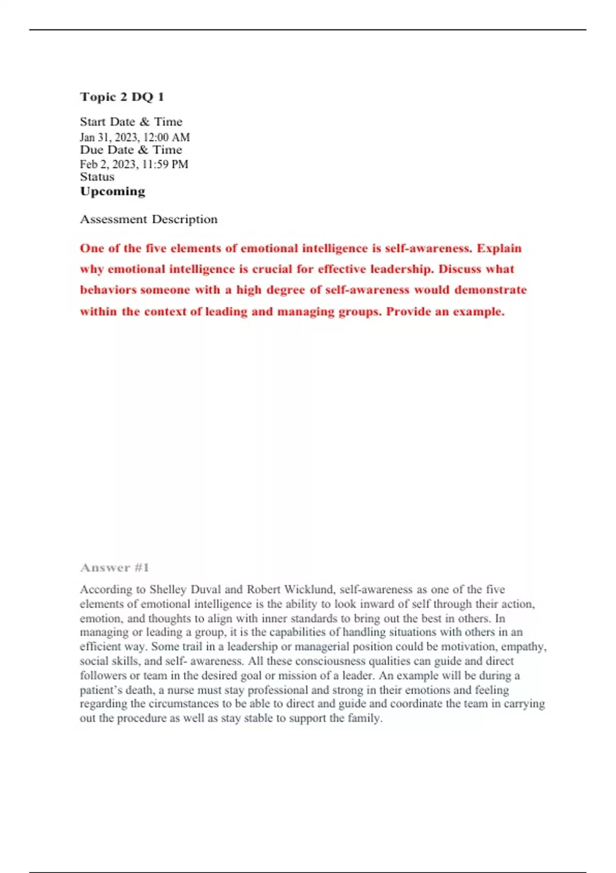 Topic2DQ1 StartDate&Time Jan31,2023,12:00AM DueDate&Time Feb2,2023,11:59PM Status Upcoming AssessmentDescription Oneofthefiveelementsofemotionalintelligenceisself-awareness.Explainwhyemotionalintelligenceiscrucialforeffectiveleadership.Discusswhatbehaviorssomeonewithahighdegreeofself-awarenesswoulddemonstratewithinthecontextofleadingandmanaginggroups