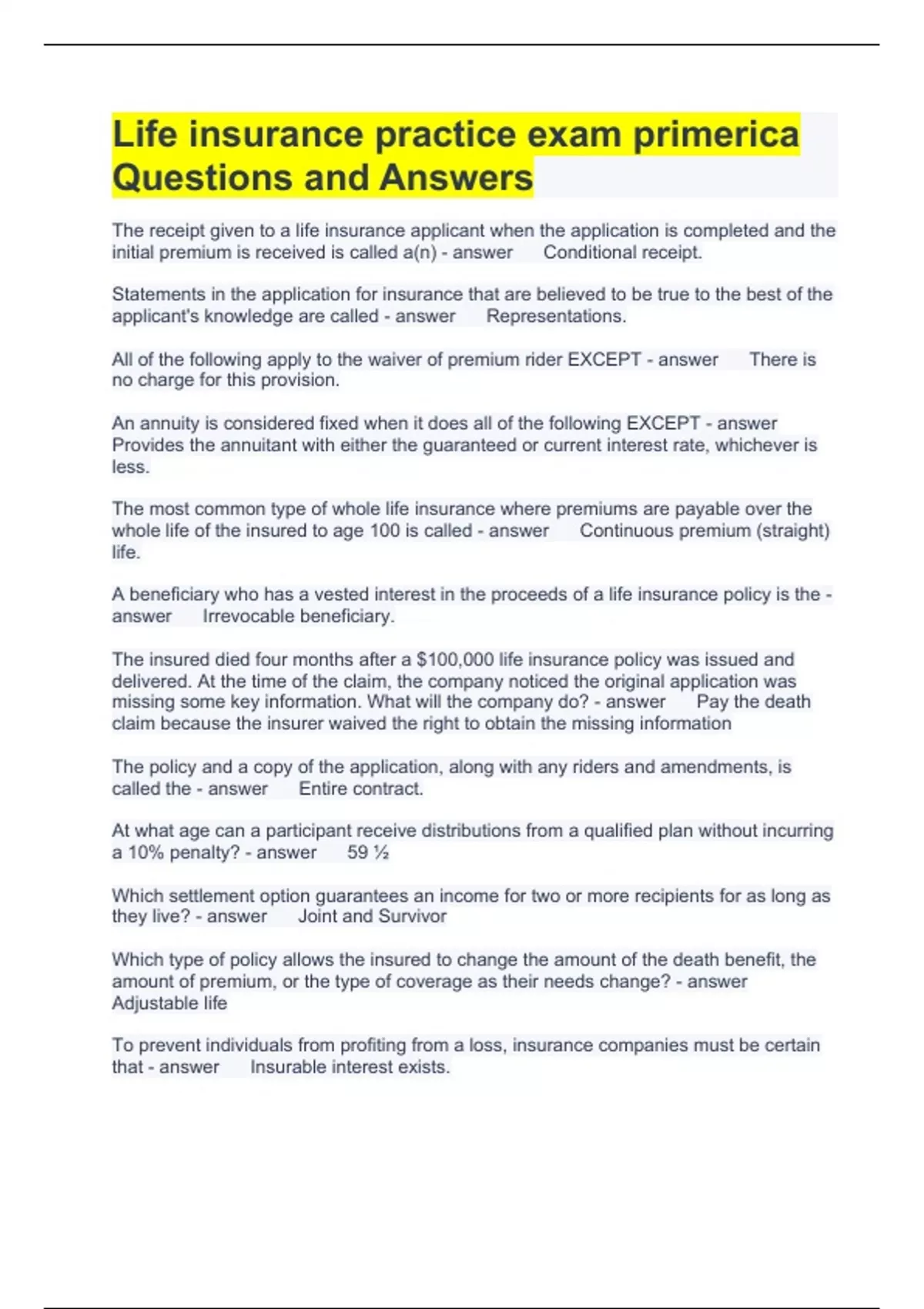Life insurance practice exam primerica Questions and Answers The receipt given to a life insurance applicant when the application is completed and the initial premium is received is called a(n) Conditional receipt. Statements in the application for insurance that are believed to be true to the best of the applicant's knowledge are called Representations. All of the following apply to the waiver of premium rider EXCEPT There is no charge for this provision. An annuity is considered fixed when it does all of the following EXCEPT Provides the annuitant with either the guaranteed or current interest rate, whichever is less. The most common type of whole life insurance where premiums are payable over the whole life of the insured to age 100 is called Continuous premium (straight) life. A beneficiary who has a vested interest in the proceeds of a life insurance policy is the Irrevocable beneficiary. The insured died four months after a $100,000 life insurance policy was issued and delivered. At the time of the claim, the company noticed the original application was missing some key information. What will the company do? Pay the death claim because the insurer waived the right to obtain the missing information The policy and a copy of the application, along with any riders and amendments, is called the Entire contract. At what age can a participant receive distributions from a qualified plan without incurring a 10% penalty? 59 ½ Which settlement option guarantees an income for two or more recipients for as long as they live? Joint and Survivor Which type of policy allows the insured to change the amount of the death benefit, the amount of premium, or the type of coverage as their needs change? Adjustable life To prevent individuals from profiting from a loss, insurance companies must be certain that Insurable interest exists. If a misstatement of age is discovered during the processing of a life insurance claim, what will the insurance company do? Adjust the death benefit based on the premiums that were paid. Each of the following is a typical characteristic of group life insurance EXCEPT Evidence of insurability is usually required. A life settlement option that pays out the death benefit incrementally, in a specified amount until all of the proceeds are exhausted is called Fixed-amount installments A life insurance death benefit paid in a lump sum to a beneficiary is Not subject to any taxes. Information collected from employment records, credit reports or other sources that includes written or oral information concerning credit, character, reputation or habits is called a(n) Investigative Consumer Report. An annuity that is purchased with a lump-sum payment and begins income payments within one year is a Single premium immediate annuity. Which statement is INCORRECT concerning policy dividends? The insurance company may guarantee dividends. What is the risk classification for those who are insurable, but present a higher than average risk? Substandard At age 25, an individual purchased a decreasing term policy. What does that say about the coverage and the premium? The coverage decreases but the premium stays the same. Underwriting is the process of Determining the insurance company's risk regarding a proposed insured. 23. A whole life product that covers two lives and provides for payment of the death benefit on the death of the first insured is called Joint Life. A producer delivers a policy to an insured, but nine days later the insured returns the policy and wants a complete refund. What provision allows the insured to return the policy? Free Look Which of the following retirement plans is a special tax favored plan for nonprofit, charitable, educational or religious groups? 403(b) Tax-sheltered Annuity (TSA) The MIB is a nonprofit trade association that maintains Medical information on applicants for life and health insurance. What is the purpose of the grace period in life insurance policies? To protect the policyowner against an unintentional lapse of the policy period of time, and the policyowner What type of permanent insurance allows the policyowner to pay for a policy in a specified does not have to make any more premium payments for the life of the policy? Limited Payment What does the payor benefit rider protect? Premium payments for a juvenile policy How long does an employee have to convert a group policy to an individual policy without evidence of insurability? days 31 If the cash value exceeds the premiums paid in a whole life policy, what are the tax consequences if the policy is surrendered? The portion that exceeds the premiums paid is taxable. Betty is the only beneficiary named on her husband Bob', policy which has a Common Disaster provision. They are in a car accident, and Bob dies instantly. Betty lives for 29 days. Who will receive the death benefit? Bob's estate The legal transfer of all or part of a policyowner's rights, title or interest is called a(n) Assignment. What do employees receive under a group contract? Certificate of insurance An annuity in which investment growth is dependent on the performance of an index such as the Standard and Poor's 500 is called a(n) Equity Indexed Annuity. The premium payment mode can be best described as the Frequency with which the policy premium will be paid.