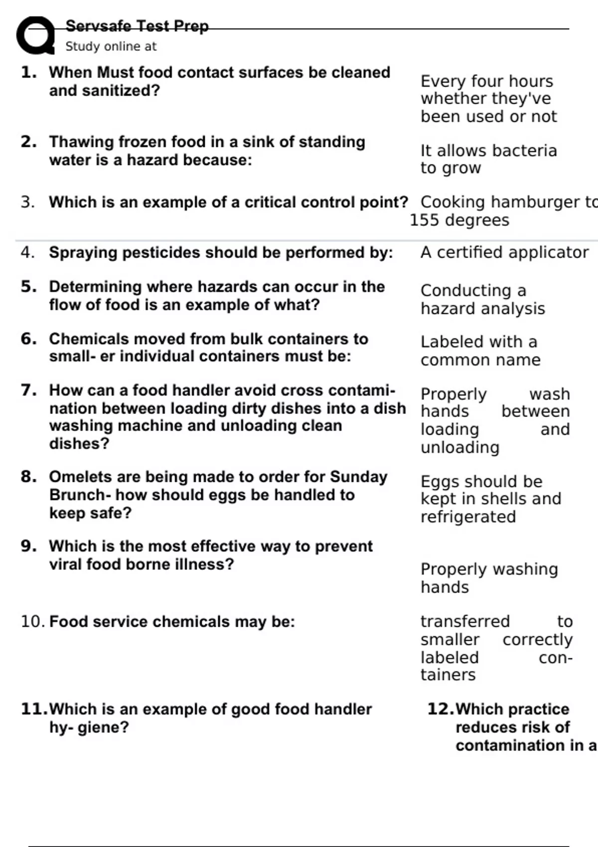 1. When Must food contact surfaces be cleaned and sanitized? 2. Thawing frozen food in a sink of standing water is a hazard because: Every four hours whether they've been used or not It allows bacteria to grow 3. Which is an example of a critical control point? Cooking hamburger to 155 degrees 4. Spraying pesticides should be performed by: A certified applicator 5. Determining where hazards can occur in the flow of food is an example of what? 6. Chemicals moved from bulk containers to small- er individual containers must be: 7. How can a food handler avoid cross contami- nation between loading dirty dishes into a dish washing machine and unloading clean dishes? 8. Omelets are being made to order for Sunday Brunch- how should eggs be handled to keep safe? 9. Which is the most effective way to prevent viral food borne illness? Conducting a hazard analysis Labeled with a common name Properly wash hands between loading and unloading Eggs should be kept in shells and refrigerated Properly washing hands 10. Food service chemicals may be: transferred to smaller correctly labeled con- tainers 11. Which is an example of good food handler hy- giene? 12. Which practice reduces risk of contamination in a food prep area? Wearing hair restraints Drinking from a covered container with a straw 13. 13. A properly equipped hand washing station must have which of the following? Hot and cold running water 14. The third compartment in a three part sink is for: Sanitizing 15. Which food can be transported ina galvanized metal container? 16. Food can become contaminated when a food handler: 17. By washing hands each time before entering a food prep area, managers: 18. Which human disease is transmitted through food? 19. Which is an important safe food handling prac- tice? 20. Food safety training is important in operations because: 21. A pan is being washed in a three-compartment sink, there are bits of food stuck to it, what is the proper order for washing? 22. To protect guests from food borne illness, preset tableware should be: 23. It is important for a manger to be familiar with symptoms of a food borne illnesses: Enriched flour Eats while working Model correct behavior Hepatitis A Cooking food to correct internal temperature it provides food handlers with the knowledge to handle food safely Scrape, wash, rinse, sanitize, air dry wrapped with a napkin to restrict food handlers as required 24. A catering service uses the sturdy boxes that raw Raw meat juices may chuck roast came in to transport sandwiches and salads, what is wrong with this? contaminate the ready to eat food 25. A box of rice should be rejected if: box bottoms are wa- ter-stained 26. Where should chemicals be stored? In a storage area with single service items 27. Cross contamination can occur if which raw foods are stored together during transportation? Ground beef and whole cuts of meat 28. An operation installs antiseptic dispensers, what should managers explain to food service work- ers? Hand antiseptic may be applied after properly washing hands 29. The internal temperature of food can best be determined by a: Bi-metallic stemmed thermometer (or digital thermometer or pene- tration probe) 30. How far off of the floor should cleaned and sani- tized utensils and cooking vessels be stored 6 inches 31. What is the order in a three-compartment sink? Wash, rinse,sanitize. 32. Which procedure best prevents an outbreak of Hepatitis A Virus Washing hands thor- oughly 33. When is an operation required to have more than one type of sanitation test kit? When using more than one type of sanitizer 34. Cut melons should be stored at what tempera- ture? 41 degrees F or Colder 35. Which is the source of the virus that causes Hepatitis A? Feces contaminated water 36. Food contamination resulting in food borne ill- ness is most often caused by Unwashed Hands 37. All parts of raw foods cooked in a microwave must reach what temperature for two minutes? 165 degrees F 38. Cooked beans Which food should be delivered to an offsite lo- cation a 41 degrees F or cooler or 135 degrees F or hotter? 39. What is one of the five CDC risk factors? Inadequated cooking 40. Serving utensils are used when serving food in order to 41. Fruits and vegetables that are cooked must reach a temperature of at least Deep food handlers bare hands of of food 135 degrees F 42. When implementing a program to prevent pests, Work with a pest control it is best to 43. Which food should be stored below all others on a food storage rack? 44. A food handler lifts a garbage bag over a food prep counter on his way to the garbage, what should the manager do? 45. One example of cross contamination is when a food handler 46. A food handler is using a nylon scrub pad to remove dirt from pots and pans in a three part sink, What is he doing? operator. Raw poultry Stop, correct and re- train. uses the same ice for serving drinks as cool- ing bottles. Cleaning. 47. What is a cross connection? a link between safe and unsafe water. 48. Food contact surfaces must be Non absorbent 49. For which activity can a hand washing sink be used? 50. Food contamination is most likely to occur when a food handler is Hand Washing. chewing tobacco in a food prep area 51. To ensure food safety a manager is responsible for overseeing a food handler's 52. A Critical Control Point is a step in the flow of food where 53. In order to prevent food contamination a food handler must 54. a food handler should calibrate his/her ther- mometer 55. which procedure will help prevent food contami- nation? hygiene intervention can can control hazards. practice frequent hand washing when it falls on the floor. Using tong to serve din- ner rolls to customers 56. which one is a physical contaminant? Bones in a boneless chicken breast 57. Food borne illnesses are transmitted to people through food. 58. What is the correct order, top to bottom? Salmon filet, ground beef, raw chicken breast 59. A common food allergen can be found in peanut 
