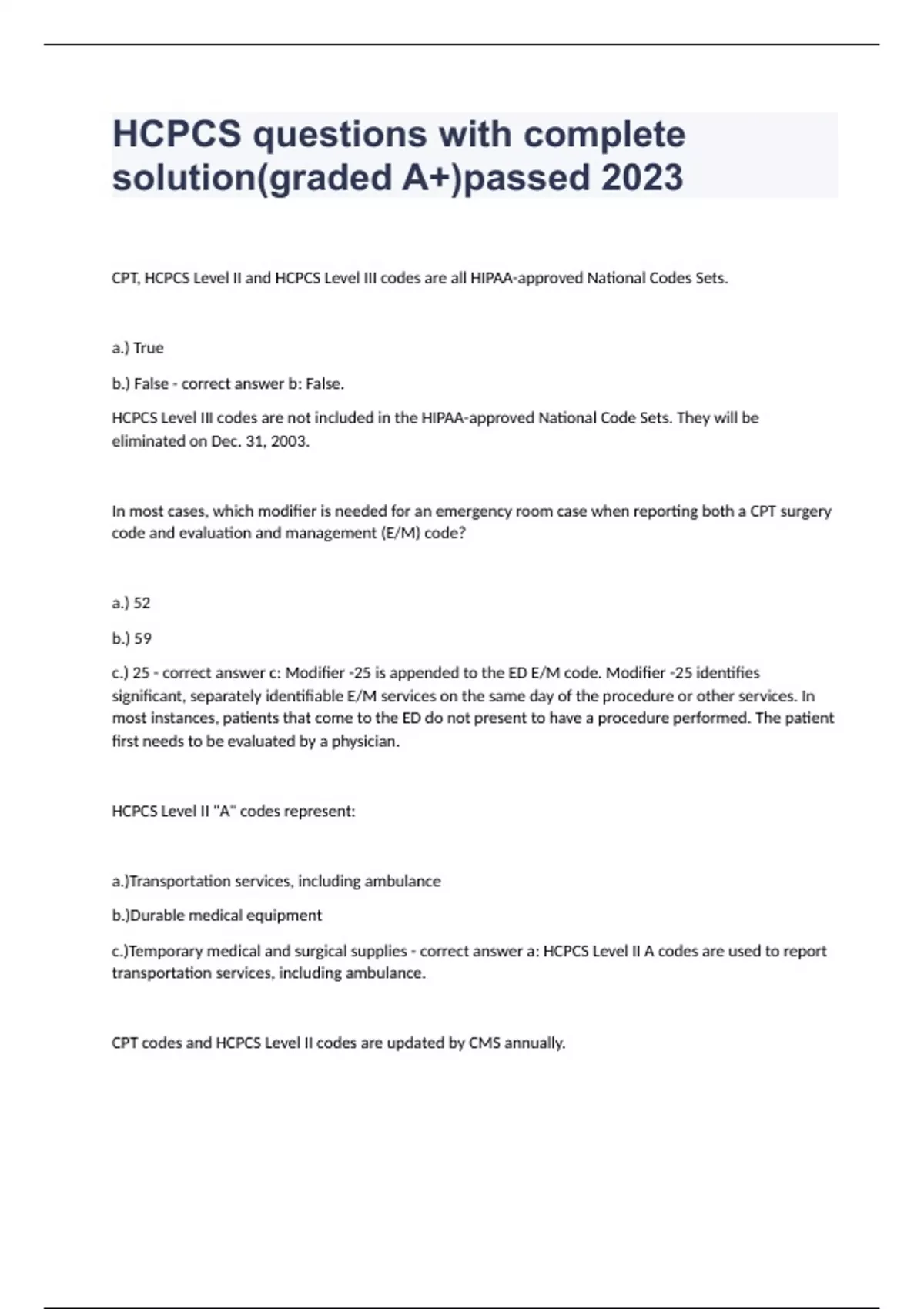 HCPCS questions with complete solution(graded A+)passed 2023CPT, HCPCS Level II and HCPCS Level III codes are all HIPAA-approved National Codes Sets. a.) True b.) False - correct answer b: False. HCPCS Level III codes are not included in the HIPAA-approved National Code Sets. They will be eliminated on Dec. 31, 2003. In most cases, which modifier is needed for an emergency room case when reporting both a CPT surgery code and evaluation and management (E/M) code? a.) 52 b.) 59 c.) 25 - correct answer c: Modifier -25 is appended to the ED E/M code. Modifier -25 identifies significant, separately identifiable E/M services on the same day of the procedure or other services. In most instances, patients that come to the ED do not present to have a procedure performed. The patient first needs to be evaluated by a physician. HCPCS Level II "A" codes represent: a.)Transportation services, including ambulance b.)Durable medical equipment c.)Temporary medical and surgical supplies - correct answer a: HCPCS Level II A codes are used to report transportation services, including ambulance. CPT codes and HCPCS Level II codes are updated by CMS annually. a.) True b.) False - correct answer b: False. HCPCS Level II codes are updated by CMS. CPT codes are not. CPT codes are updated by AMA. A flexible diagnostic colonoscopy is performed. During the procedure, a polyp is removed from one area and a lesion is removed from another. Both the polyp and the lesion are removed by snare technique. Which of the following would be the appropriate code selection? a) 45378-59, 45385, 45385-59 b) 45385, 45385-59 c) 45385 d) 45378-59, 45385 - correct answer c: Only code 45385 is reported. The diagnostic colonoscopy is not coded separately. Notice the separate procedure designation. The diagnostic colonoscopy is included in the code for any definitive procedure performed. 45385 is not reported twice because the description of the code indicates "with removal of tumor(s), polyp(s), or other lesion(s) by snare technique." Therefore, all tumors, polyps or lesions removed using this technique are reported only once. The same CCI edits are used by CMS for editing both physician and hospital outpatient services. a) True b) Fals - correct answer b: False. The CCI edits used by CMS to edit physician and hospital outpatient services are not the same. CMS uses the most current version of CCI edits to edit physician services. The CCI edits used by CMS to edit hospital outpatient services are included in the Outpatient Code Editor (OCE) and is one release behind. Also, the CCI edits included in the OCE do not include the entire CCI table. On April 15, 2003, it was appropriate to bill services provided on March 15, 2003, using either 2002 or 2003 HCPCS codes because of the grace period.