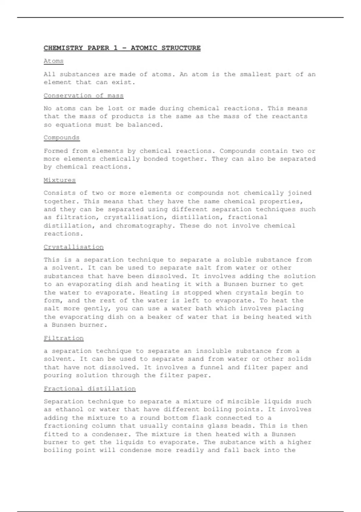 Summary AQA GCSE CHEMISTRY PAPER 1 - Atomic Structure