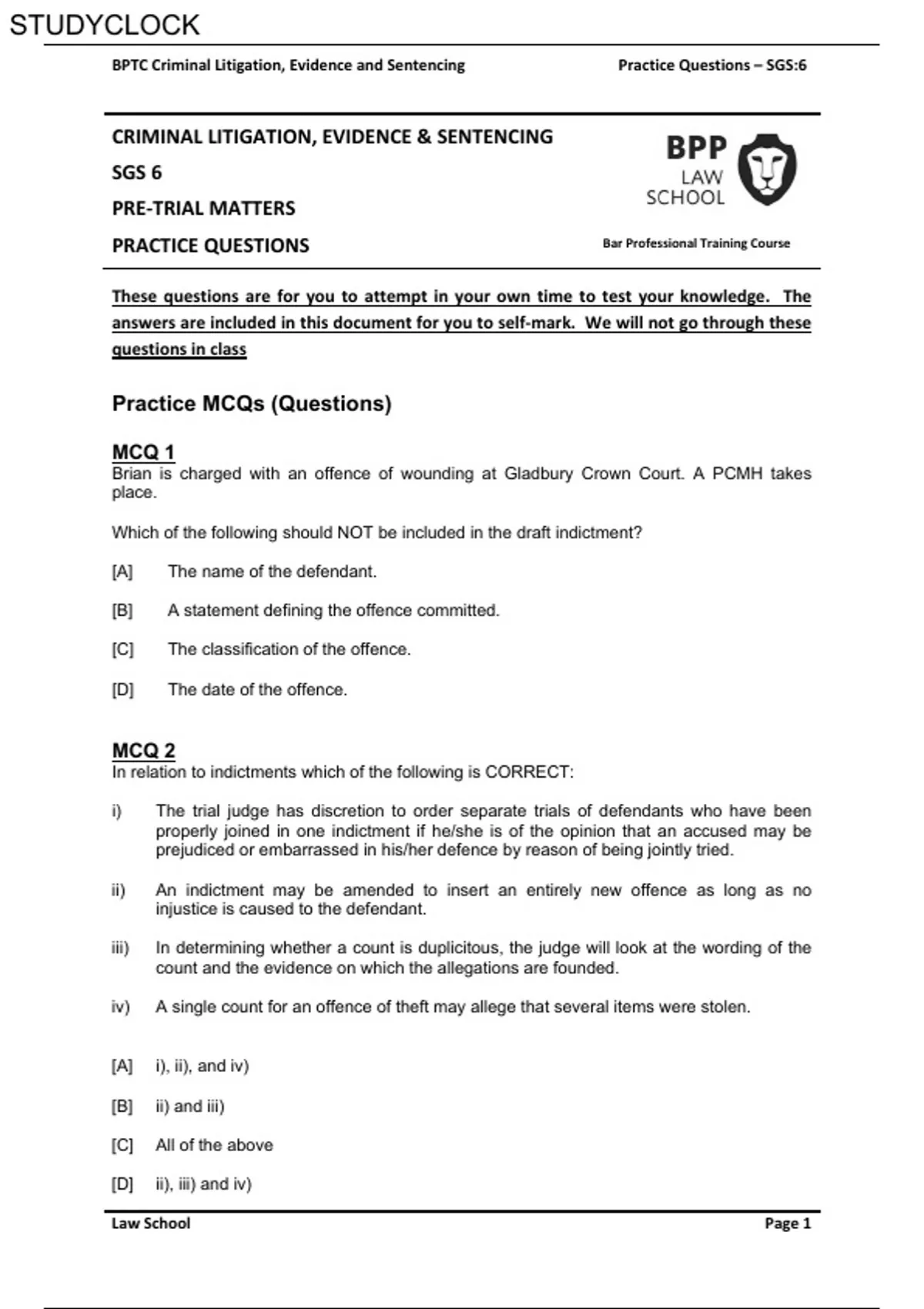 BPTC Criminal Litigation, Evidence and Sentencing Practice Questions – SGS:6