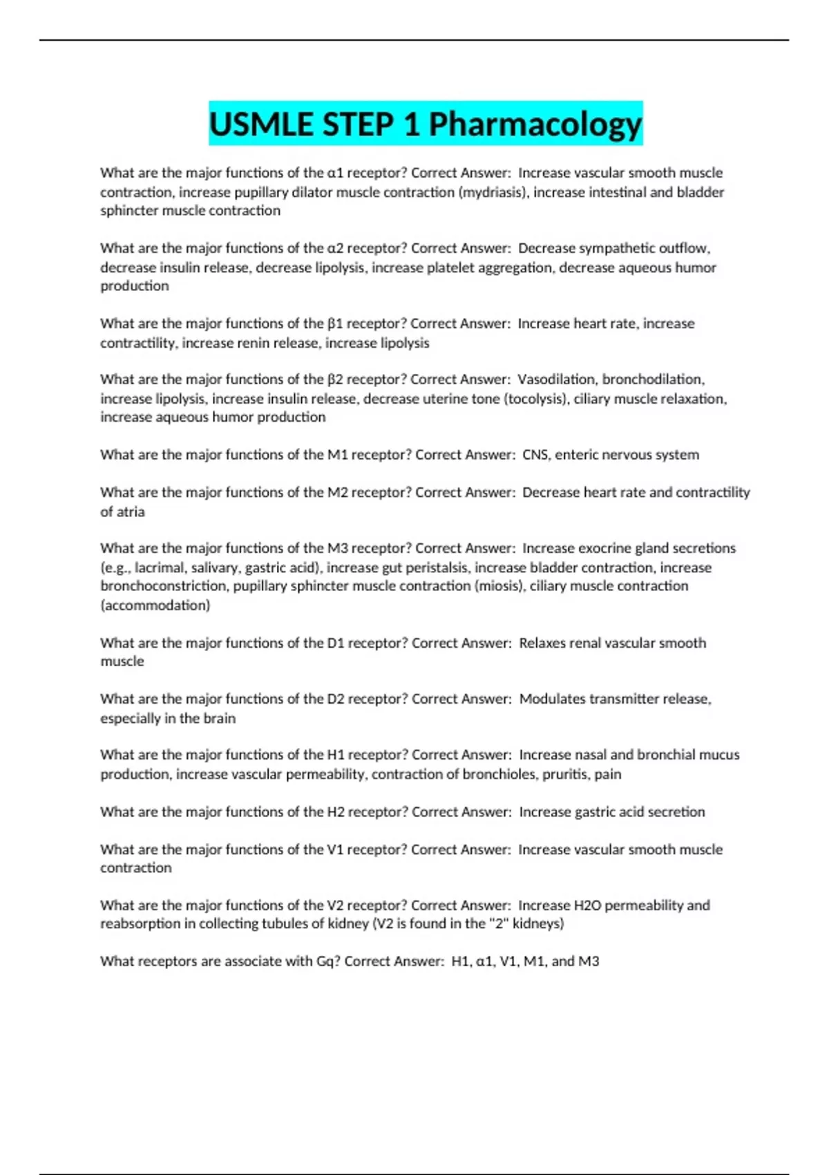 What are the major functions of the α1 receptor? Correct Answer: Increase vascular smooth muscle contraction, increase pupillary dilator muscle contraction (mydriasis), increase intestinal and bladder sphincter muscle contraction What are the major functions of the α2 receptor? Correct Answer: Decrease sympathetic outflow, decrease insulin release, decrease lipolysis, increase platelet aggregation, decrease aqueous humor production What are the major functions of the β1 receptor? Correct Answer: Increase heart rate, increase contractility, increase renin release, increase lipolysis What are the major functions of the β2 receptor? Correct Answer: Vasodilation, bronchodilation, increase lipolysis, increase insulin release, decrease uterine tone (tocolysis), ciliary muscle relaxation, increase aqueous humor production What are the major functions of the M1 receptor? Correct Answer: CNS, enteric nervous system What are the major functions of the M2 receptor? Correct Answer: Decrease heart rate and contractility of atria What are the major functions of the M3 receptor? Correct Answer: Increase exocrine gland secretions (e.g., lacrimal, salivary, gastric acid), increase gut peristalsis, increase bladder contraction, increase bronchoconstriction, pupillary sphincter muscle contraction (miosis), ciliary muscle contraction (accommodation) What are the major functions of the D1 receptor? Correct Answer: Relaxes renal vascular smooth muscle What are the major functions of the D2 receptor? Correct Answer: Modulates transmitter release, especially in the brain What are the major functions of the H1 receptor? Correct Answer: Increase nasal and bronchial mucus production, increase vascular permeability, contraction of bronchioles, pruritis, pain What are the major functions of the H2 receptor? Correct Answer: Increase gastric acid secretion What are the major functions of the V1 receptor? Correct Answer: Increase vascular smooth muscle contraction What are the major functions of the V2 receptor? Correct Answer: Increase H2O permeability and reabsorption in collecting tubules of kidney (V2 is found in the "2" kidneys) What receptors are associate with Gq? Correct Answer: H1, α1, V1, M1, and M3 What receptors are associated with Gs? Correct Answer: H2, B1, B2, V2, D1 What receptors are associated with Gi? Correct Answer: M2, α2, D2 Bethanechol Correct Answer: -Direct cholinergic agonist -Activates bowel and bladder smooth muscle -Used in postoperative and neurogenic ileus -Resistant to AChE Carbachol Correct Answer: -Direct cholinergic agonist -Carbon copy of acetylcholine -Constricts pupils and relieves intraocular pressure in glaucoma Methacholine Correct Answer: -Direct cholinergic agonist -Stimulates muscarinic receptors in airways when inhaled -Used as a challenge test for diagnosis of asthma Pilocarpine Correct Answer: -Direct cholinergic agonist -Contracts ciliary muscle of eye (open angle glaucoma), contracts pupillary sphincter (closed angle glaucoma) -Potent stimulator of sweat, tears and saliva -AChE resistant Donepezil Correct Answer: -Anticholinesterse - increases ACh -Alzheimer disease Galantamine Correct Answer: -Anticholinesterse - increases ACh -Alzheimer disease Rivastigmine Correct Answer: -Anticholinesterse - increases ACh -Alzheimer disease Edrophonium Correct Answer: -Anticholinesterse - increases ACh -Historically used to diagnose myasthenia gravis (MG is now diagnosed by anti-AChR Ab test. Neostigmine Correct Answer: -Anticholinesterse - increases ACh -Used in postoperative and neurogenic ileus and urinary retention, myasthenia gravis, and postoperative reversal of neuromuscular junction blockade Physostigmine Correct Answer: -Anticholinesterse - increases ACh -Used in anticholinergic toxicity -Crosses the blood-brain barrier (CNS) Pyridostigmine Correct Answer: -Anticholinesterse - increases ACh -Increases muscle strength -Used in myasthenia gravis (long acting) -Does not penetrate CNS Atropine Correct Answer: -Muscarinic antagonist -Used in bradycardia and for ophthalmic applications -Also used as antidote for cholinesterase inhibitor poisoning -Actions include increase pupil dilation, cycloplegia, decreased airway secretions, decreased acid secretions, decreased gut motility, decreased bladder urgency in cystitis -Toxicity: increased body temp (due to decreased sweating), rapid pulse, dry mouth, dry and flushed skin, cycloplegia, constipation, disorientation; -Can cause acute angle-closure glaucoma in elderly (due to mydriasis), urinary retention in men with prostatic hyperplasia, and hyperthermia in infants -See also homatropine and tropicamide Benztropine Correct Answer: -Muscarinic antagonist -Works in CNS -Used in Parkinson disease and acute dystonia Glycopyrrolate Correct Answer: -Muscarinic antagonist -Parental use: preoperative use to reduce airway secretions -Oral use: drooling, peptic ulcer Hyoscyamine Correct Answer: -Muscarinic antagonist -Antispasmodics for IBS Dicyclomide Correct Answer: -Muscarinic antagonist -Antispasmodics for IBS Ipratropium Correct Answer: -Muscarinic antagonist -Used in COPD and asthma Tiotropium Correct Answer: -Muscarinic antagonist -Used in COPD and asthma Oxybutynin Correct Answer: -Muscarinic antagonist -Reduced bladder spasms and urge urinary incontinence Solifenacin Correct Answer: -Muscarinic antagonist -Reduced bladder spasms and urge urinary incontinence Tolterodine Correct Answer: -Muscarinic antagonist -Reduced bladder spasms and urge urinary incontinence Scopalamine Correct Answer: -Muscarinic antagonist -Motion sickness Tetrodotoxin Correct Answer: -Poisoning can result from ingestion of poorly prepared puffer fish (exotic sushi) -Highly potent toxin that binds fast voltage-gated Na+ channels in cardiac and nerve tissue, preventing depolarization - blocks action potential without changing resting potential (same mechanism as Lidocaine) -Causes nausea, diarrhea, paresthesias, weakness, dizziness, loss of reflexes. -Treatmen