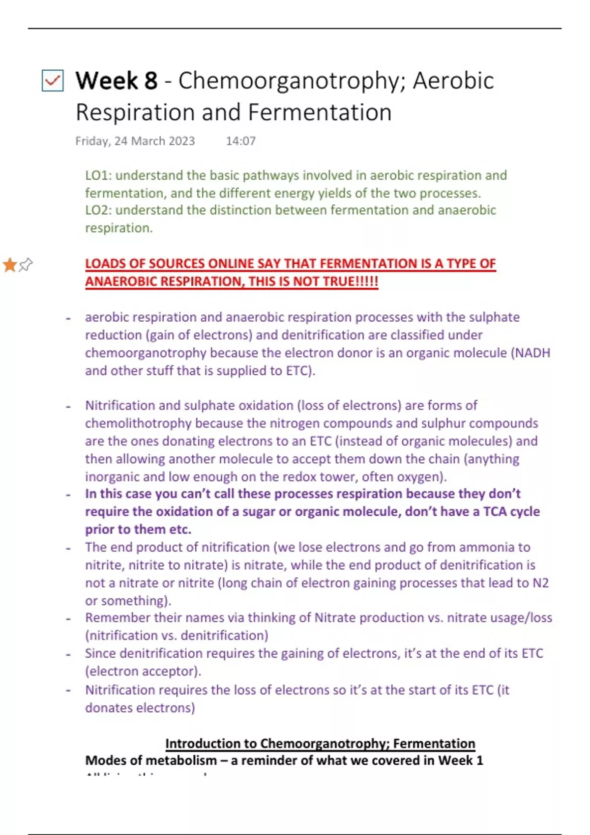 Complete lecture notes of BIO231 Microbial Physiology and Growth week 10 on Chemoorganotrophy Aerobic Respiration and Fermentation. Includes all the lectures slides content along with word-for-word commentary from lecturer and in red is my personal commentary that explains some concepts in easier terms.