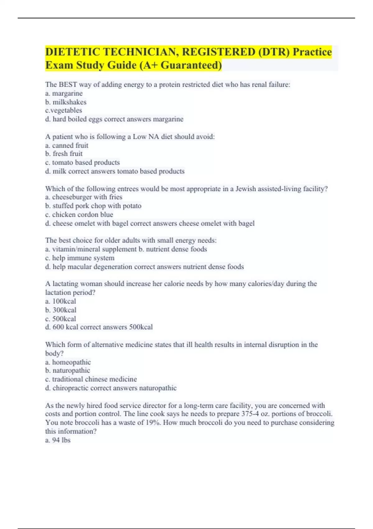 The BEST way of adding energy to a protein restricted diet who has renal failure: a. margarine b. milkshakes ables d. hard boiled eggs correct answers margarine A patient who is following a Low NA diet should avoid: a. canned fruit b. fresh fruit c. tomato based products d. milk correct answers tomato based products Which of the following entrees would be most appropriate in a Jewish assisted-living facility? a. cheeseburger with fries b. stuffed pork chop with potato c. chicken cordon blue d. cheese omelet with bagel correct answers cheese omelet with bagel The best choice for older adults with small energy needs: a. vitamin/mineral supplement b. nutrient dense foods c. help immune system d. help macular degeneration correct answers nutrient dense foods A lactating woman should increase her calorie needs by how many calories/day during the lactation period? a. 100kcal b. 300kcal c. 500kcal d. 600 kcal correct answers 500kcal Which form of alternative medicine states that ill health results in internal disruption in the body? a. homeopathic b. naturopathic c. traditional chinese medicine d. chiropractic correct answers naturopathic As the newly hired food service director for a long-term care facility, you are concerned with costs and portion control. The line cook says he needs to prepare 375-4 oz. portions of broccoli. You note broccoli has a waste of 19%. How much broccoli do you need to purchase considering this information? a. 94 lbs