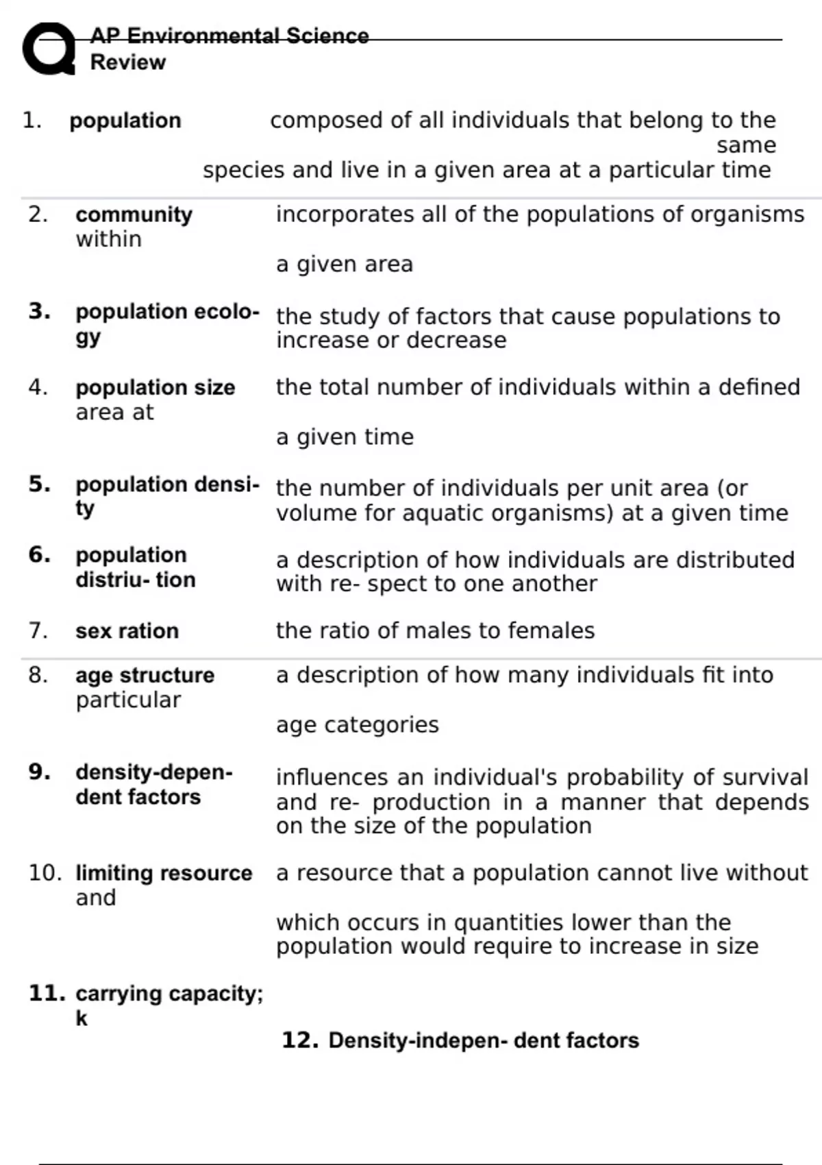 1. population composed of all individuals that belong to the same species and live in a given area at a particular time 2. community incorporates all of the populations of organisms within a given area 3. population ecolo- gy the study of factors that cause populations to increase or decrease 4. population size the total number of individuals within a defined area at a given time 5. population densi- ty 6. population distriu- tion the number of individuals per unit area (or volume for aquatic organisms) at a given time a description of how individuals are distributed with re- spect to one another 7. sex ration the ratio of males to females 8. age structure a description of how many individuals fit into particular age categories 9. density-depen- dent factors influences an individual's probability of survival and re- production in a manner that depends on the size of the population 10. limiting resource a resource that a population cannot live without and which occurs in quantities lower than the population would require to increase in size 11. carrying capacity; k 12. Density-indepen- dent factors 13. growth rate population growth slowed as population size increased because there was a limit to how many individuals the food supply could sustain have the same effect on an individuals probability of survival and amount of reproduction at any population size 14. intrinsic growth rate; r 15. exponential growth model 16. logistic growth model the number of offspring an individual can produce in a given time period, minus the deaths of the individual or offspring during the same period under ideal conditions, with unlimited resources avail- able, every population has a particular maximum poten- tial for growth tells us that, under ideal conditions, the future size of the population depends on the current size of the popula- tion, the intrinsic rate of the population, and the amount of time over which the population grows describes a population whose growth is initially expo- nential, but slows as the population approaches the carrying capacity of the environment 17. overshoot when the population becomes larger than the spring carrying capacity 18. Die-off population crash usually experienced after the over- shoot of the carrying capacity 19. k-selected species species that have a low intrinsic growth rate, which causes their populations to increase slowly until they reach the carrying capacity of the environment 20. r-selected species species that have a high intrinsic growth rate because they reproduce often and produce large numbers of offspring 21. survivorship curves graphs of distinct patterns of survival over time 22. corridors strips of habitat that connect separated populations that the animal travels across 23. metapopulations a group of spatially distinct populations that are connect- ed by occasional movements of individuals between them 24. community ecolo- gy the study of species interactions, which determine the survival of a species in a habitat 25. competition the struggle of individuals to obtain a limiting resource 26. competitive exclu- sion principle 27. resource partition- ing states that two species competing for the same limiting resource cannot coexist where two species divide a resource based on differ- ences in the species' behavior or morphology 28. predation refers to the use of one species as a resource by another species 29. true predators typically kill their prey and consume most of what they kill 30. herbivores consumes plants as prey 31. parasites live on or in the organisms they consume 32. parasitoids organisms that lay eggs inside other organims 33. mutualism benefits two interacting species by increasing both species' chances of survival or reproduction 34. commensalism a type of relationship in which one species benefits but the other is neither harmed nor helped 35. symbiotic rela- tionship the relationship of two species that live in close associ- ation with each other 36. keystone species a species that plays a role in its community 37. predator-mediat- ed competition 38. ecosystem engi- neers competition in which a predator is instrumental in re- ducing the abundance of a superior competitor, allowing inferior competitors to persist species that create or maintain habitat for other species 39. ecological suc- cession 40. primary succes- sion 41. secondary suc- cession the predictable replacement of one group of species by another group of species over time occurs on surfaces that are intially devoid of soil occurs in areas that have been disturbed but have not lost their soil 42. pioneer species organisms that have the ability to colonize new areas rapidly and grow well in full sunshine 43. theory of island biogeography demonstrates the dual importance of habitat size and distance in determining species richness 44. Aquifers Permeable layers of rock and sediment that contain groundwater in many small spaces. 45. Unconfined Aquifer Water can flow easily in and out of the aquifer. Porous rock covered by soil 46. Confined Aquifer Aquifers covered by an impermeable and confining layer impeding water flow in or out. 47. Water Table Uppermost aquifer layer where water fully saturates the rock or soil. 48. Groundwater Recharge Water from precipitation percolates through soil and into aquifer. If confined, can't recharge. 49. Springs Water from some aquifers naturally comes up, natural source of freshwater 50. Artesian Wells Drilled hole in a confined aquifer releases pressure and pushes water up. 51. Cone of Depres- sion Area where there's no longer any groundwater, caused by well overuse, eventually will go dry. 52. Saltwater intru- sion Lessened pressure from over-pumping so salt water infiltrates and makes well water salty. 53. Floodplain Land adjacent to river where excess water spreads onto. 54. Oligotrophic Lakes with low productivity because of little nutrients such as phosphorus and nitrogen. 55. Mesotrophic Lakes with moderate levels of productivity