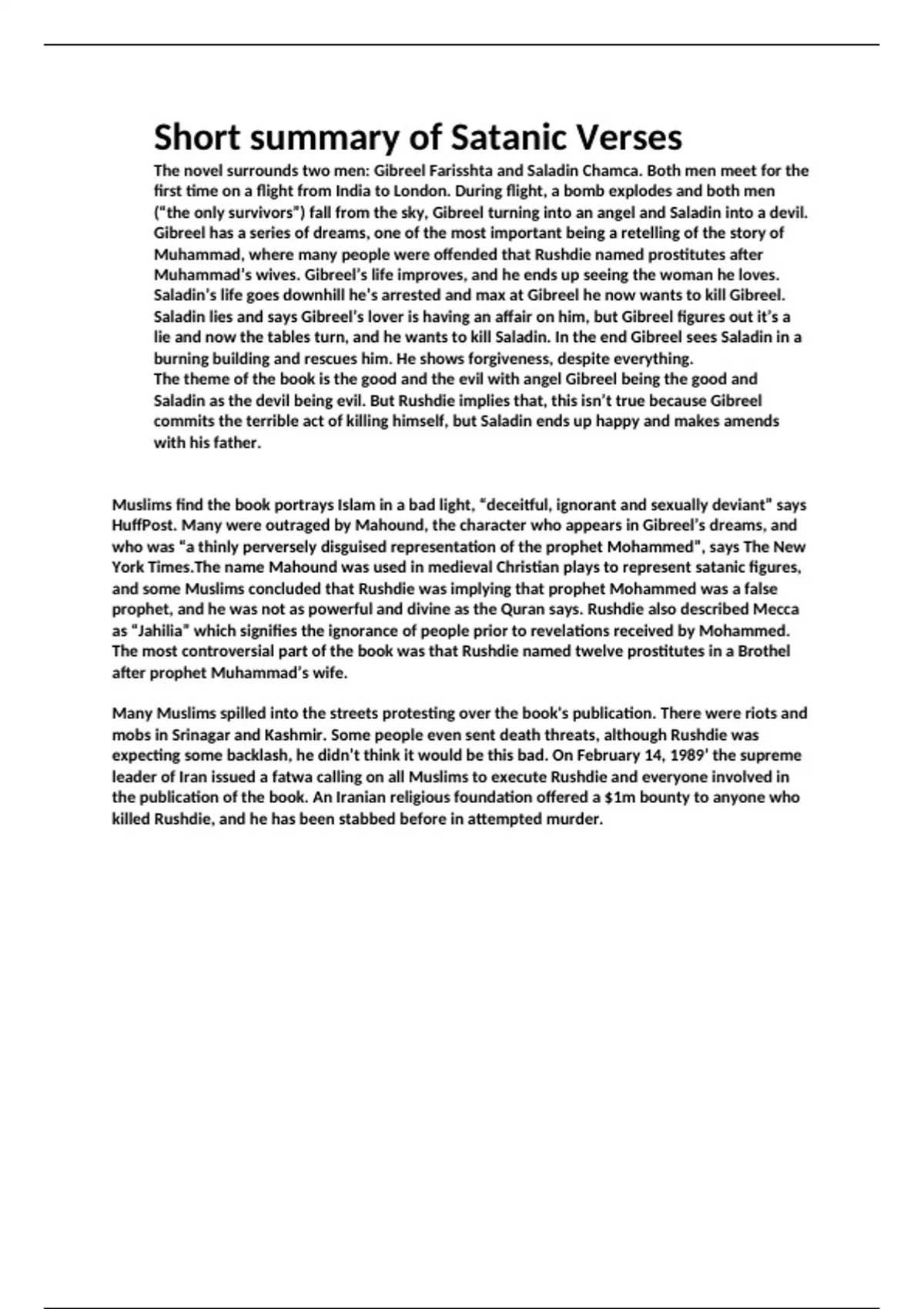 This short summary of about three paragraphs contains everything you need to know about the Satanic Verses by Salman Rushdie. The book can be quite chunky and hard to get through, especially for those doing it for RE/RS/RT (religious studies & philosophy). This is the shortest most comprehensive version out there!