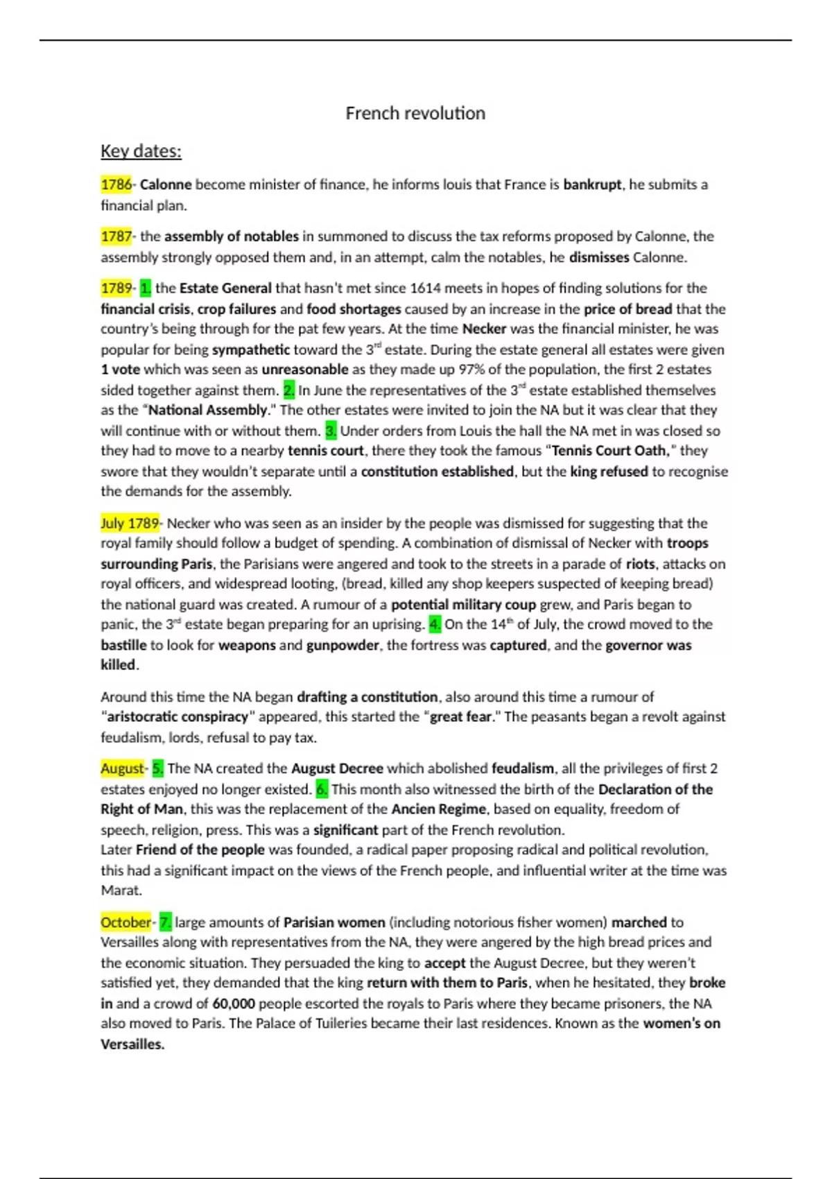 A summary of the French revolution including: key dates and their events, key terms and figures and key questions of the syllabus. Perfect for last minute recap.
