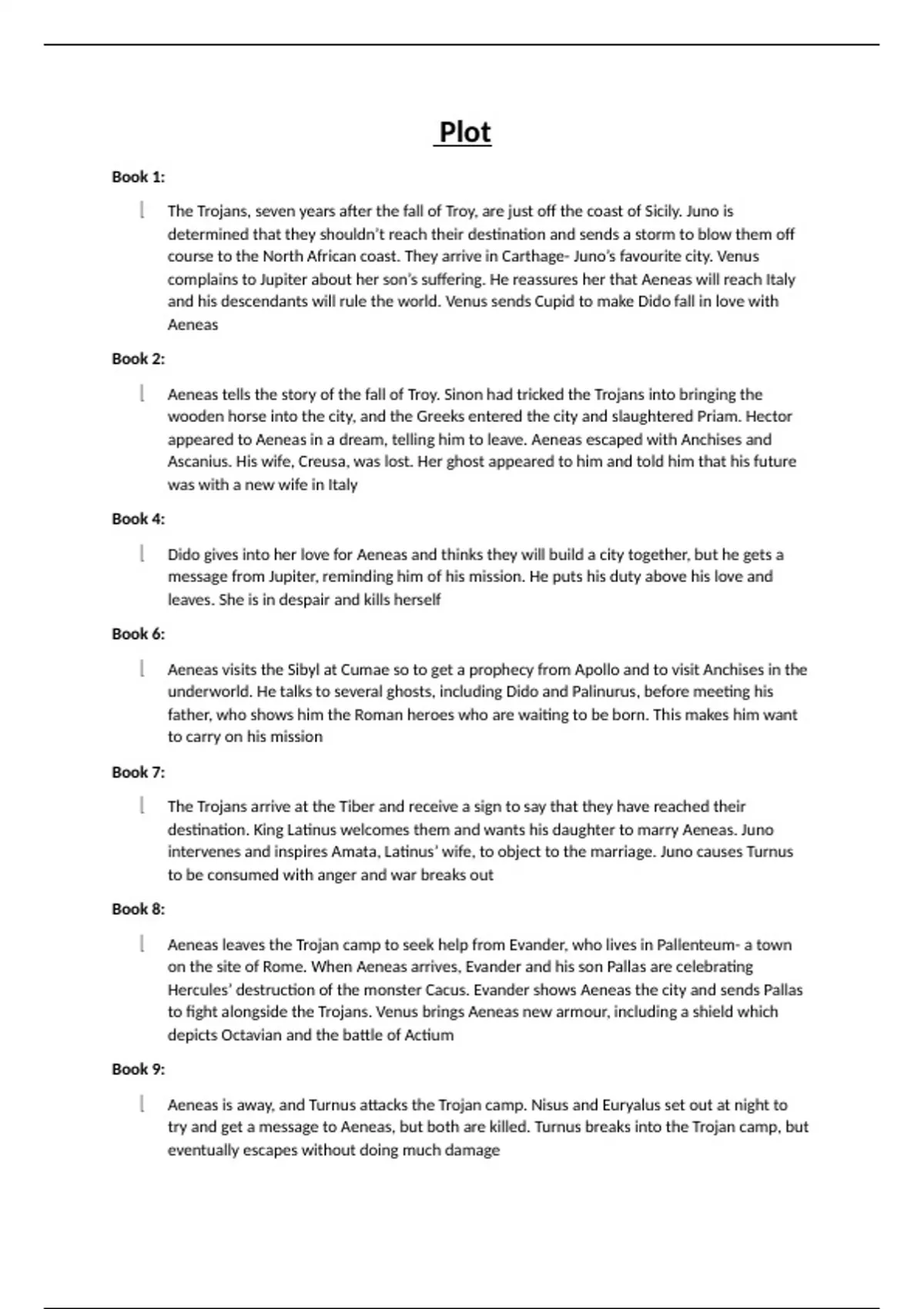 17 page document for A-Level World Of The Hero Classical Civilisation- summary of the Aeneid- has the plot of each book needed for OCR, literary techniques, themes, and character analysis' Also, more in depth notes about Aenas/Dido/the Gods/Turnus/Augustus