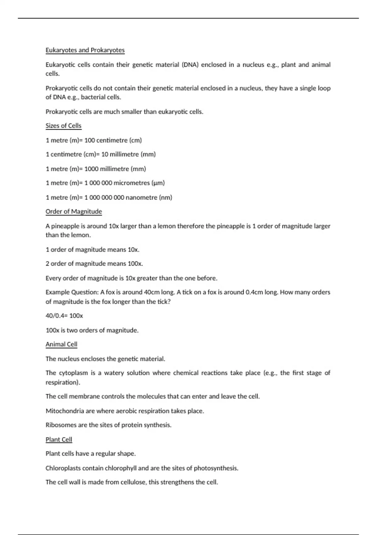 Sizes of Cells