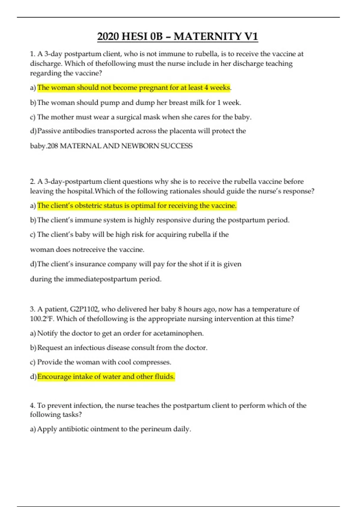 HESI 0B – MATERNITY V1.1. A 3-day postpartum client, who is not immune to rubella, is to receive the vaccine at discharge. Which of the following must the nurse include in her discharge teaching regarding the vaccine? a) The woman should not become pregnant for at least 4 weeks. b) The woman should pump and dump her breast milk for 1 week. c) The mother must wear a surgical mask when she cares for the baby. d) Passive antibodies transported across the placenta will protect the baby. 208 MATERNAL AND NEWBORN SUCCESS 2. A 3-day-postpartum client questions why she is to receive the rubella vaccine before leaving the hospital. Which of the following rationales should guide the nurse’s response? a) The client’s obstetric status is optimal for receiving the vaccine. b) The client’s immune system is highly responsive during the postpartum period. c) The client’s baby will be high risk for acquiring rubella if the woman does not receive the vaccine. d) The client’s insurance company will pay for the shot if it is given during the immediate postpartum period.