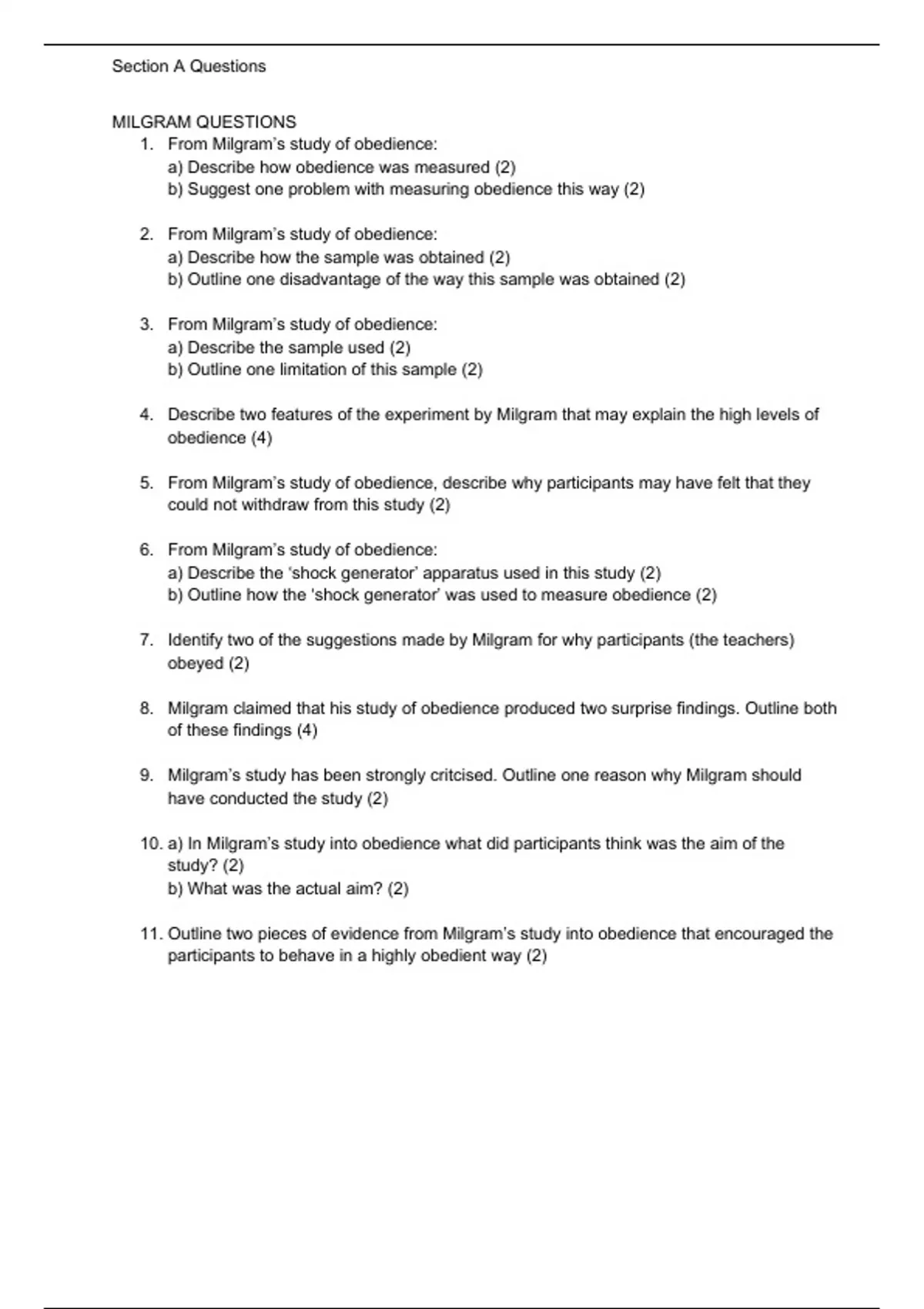 A collection of ocr-exam style questions from Section A of paper 2, core studies. Featuring the first two studies, Milgram and Bocchiaro, comprising of the social area.