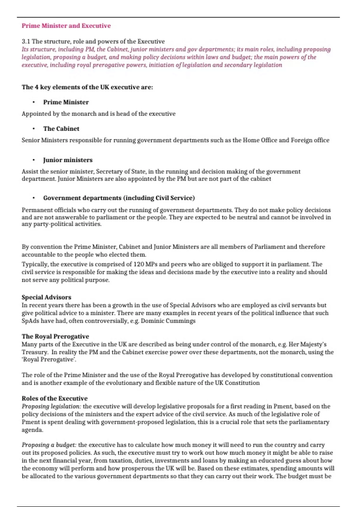 Summary A-Level Edexcel Politics Paper 2 UK Prime Minister and Executive