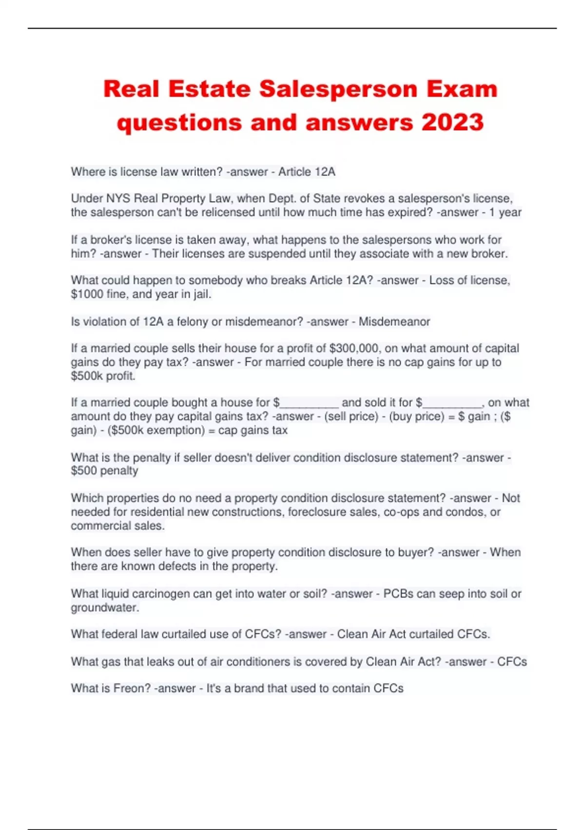 Real estate Salesperson Exam questions and answers 2023