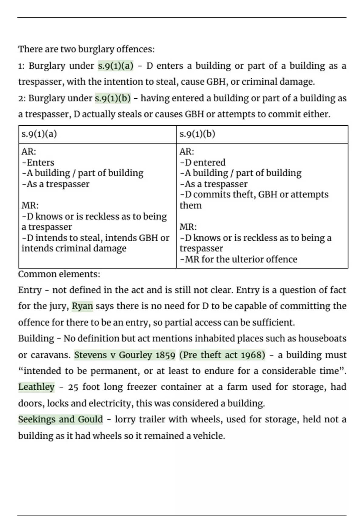 1: Burglary under s.9(1)(a) - D enters a building or part of a building as a