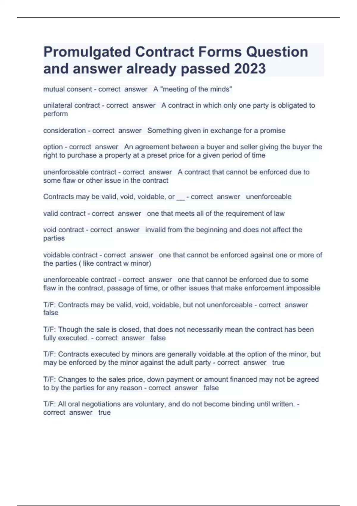 Promulgated Contract Forms Question and answer already passed 2023mutual consent A "meeting of the minds" unilateral contract A contract in which only one party is obligated to perform consideration Something given in exchange for a promise option An agreement between a buyer and seller giving the buyer the right to purchase a property at a preset price for a given period of time unenforceable contract A contract that cannot be enforced due to some flaw or other issue in the contract Contracts may be valid, void, voidable, or __ unenforceable valid contract one that meets all of the requirement of law void contract invalid from the beginning and does not affect the parties voidable contract one that cannot be enforced against one or more of the parties ( like contract w minor) unenforceable contract one that cannot be enforced due to some flaw in the contract, passage of time, or other issues that make enforcement impossible T/F: Contracts may be valid, void, voidable, but not unenforceable false T/F: Though the sale is closed, that does not necessarily mean the contract has been fully executed. false T/F: Contracts executed by minors are generally voidable at the option of the minor, but may be enforced by the minor against the adult party true