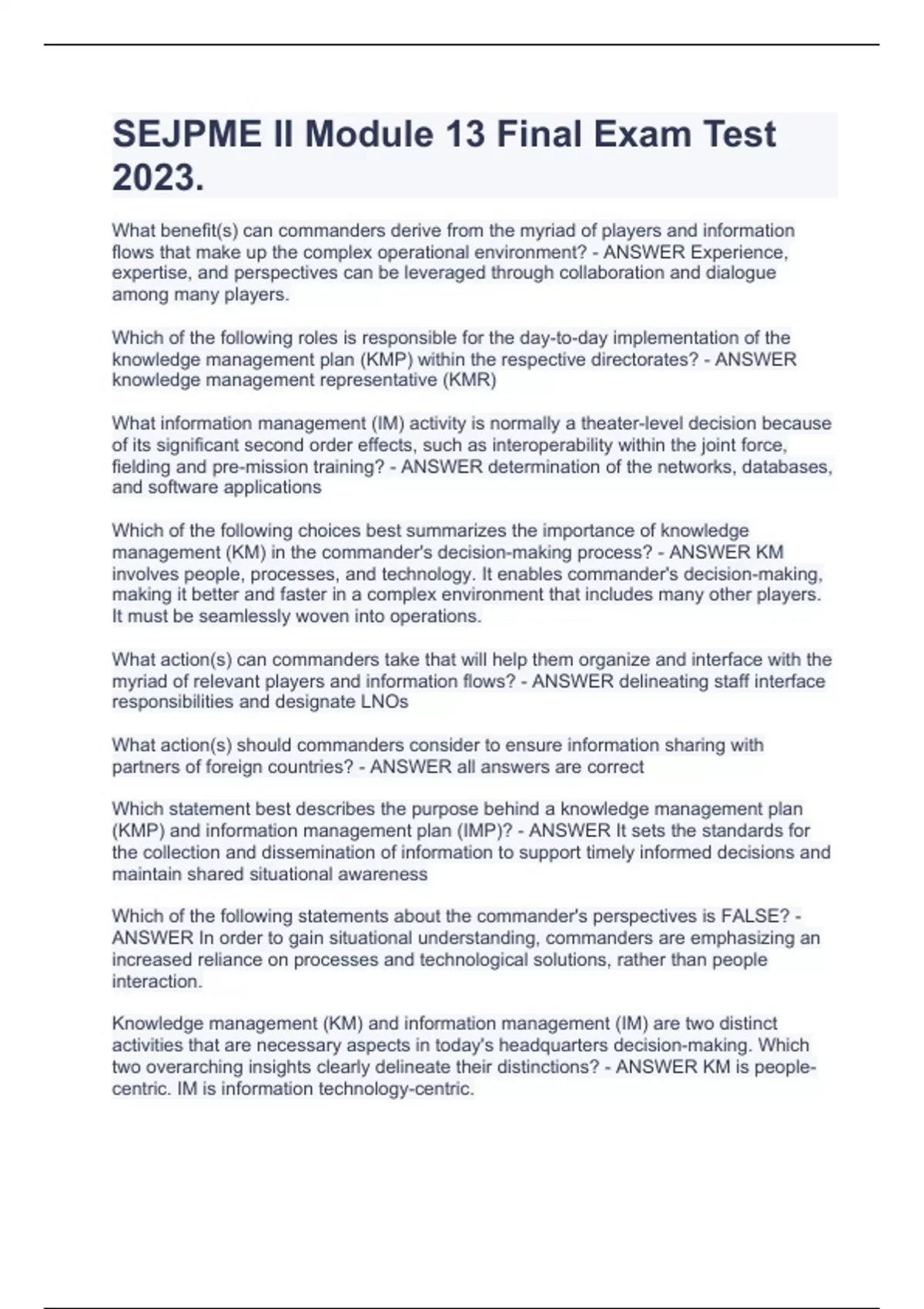 SEJPME II Module 13 Final Exam Test 2023. What benefit(s) can commanders derive from the myriad of players and information flows that make up the complex operational environment? - ANSWER Experience, expertise, and perspectives can be leveraged through collaboration and dialogue among many players. Which of the following roles is responsible for the day-to-day implementation of the knowledge management plan (KMP) within the respective directorates? - ANSWER knowledge management representative (KMR) What information management (IM) activity is normally a theater-level decision because of its significant second order effects, such as interoperability within the joint force, fielding and pre-mission training? - ANSWER determination of the networks, databases, and software applications Which of the following choices best summarizes the importance of knowledge management (KM) in the commander's decision-making process? - ANSWER KM involves people, processes, and technology. It enables commander's decision-making, making it better and faster in a complex environment that includes many other players. It must be seamlessly woven into operations. What action(s) can commanders take that will help them organize and interface with the myriad of relevant players and information flows? - ANSWER delineating staff interface responsibilities and designate LNOs What action(s) should commanders consider to ensure information sharing with partners of foreign countries? - ANSWER all answers are correct Which statement best describes the purpose behind a knowledge management plan (KMP) and information management plan (IMP)? - ANSWER It sets the standards for the collection and dissemination of information to support timely informed decisions and maintain shared situational awareness Which of the following statements about the commander's perspectives is FALSE? - ANSWER In order to gain situational understanding, commanders are emphasizing an increased reliance on processes and technological solutions, rather than people interaction. Knowledge management (KM) and information management (IM) are two distinct activities that are necessary aspects in today's headquarters decision-making. Which two overarching insights clearly delineate their distinctions? - ANSWER KM is people-centric. IM is information technology