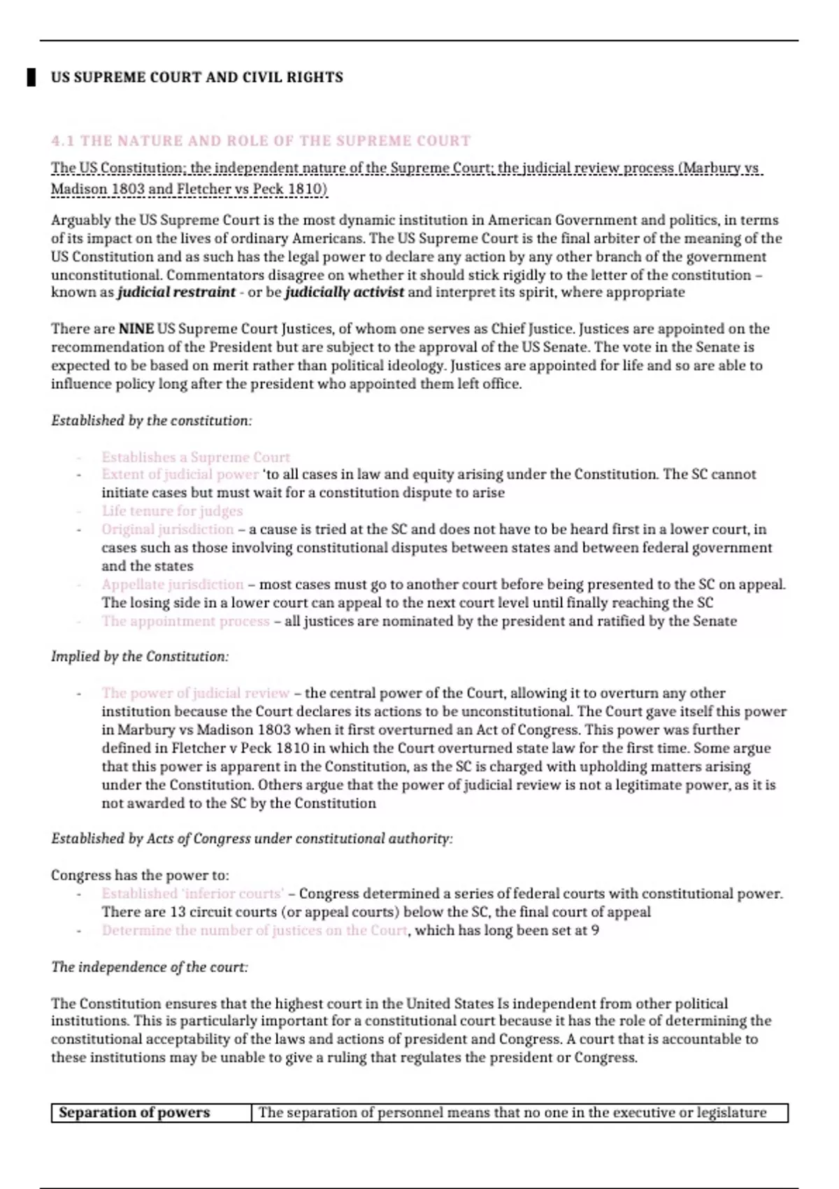 Summary A-Level Edexcel Paper 3 US Supreme Court and Civil Rights notes