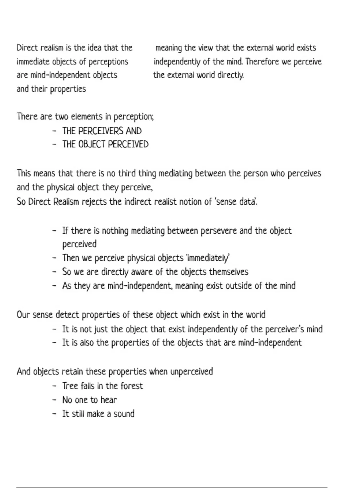 This content contains a summary/notes of Direct Realism, is extracted from different sources and it includes everthing that is to know for Direct Realism. AQA philosophy, Epistemology. Knowldge from perception