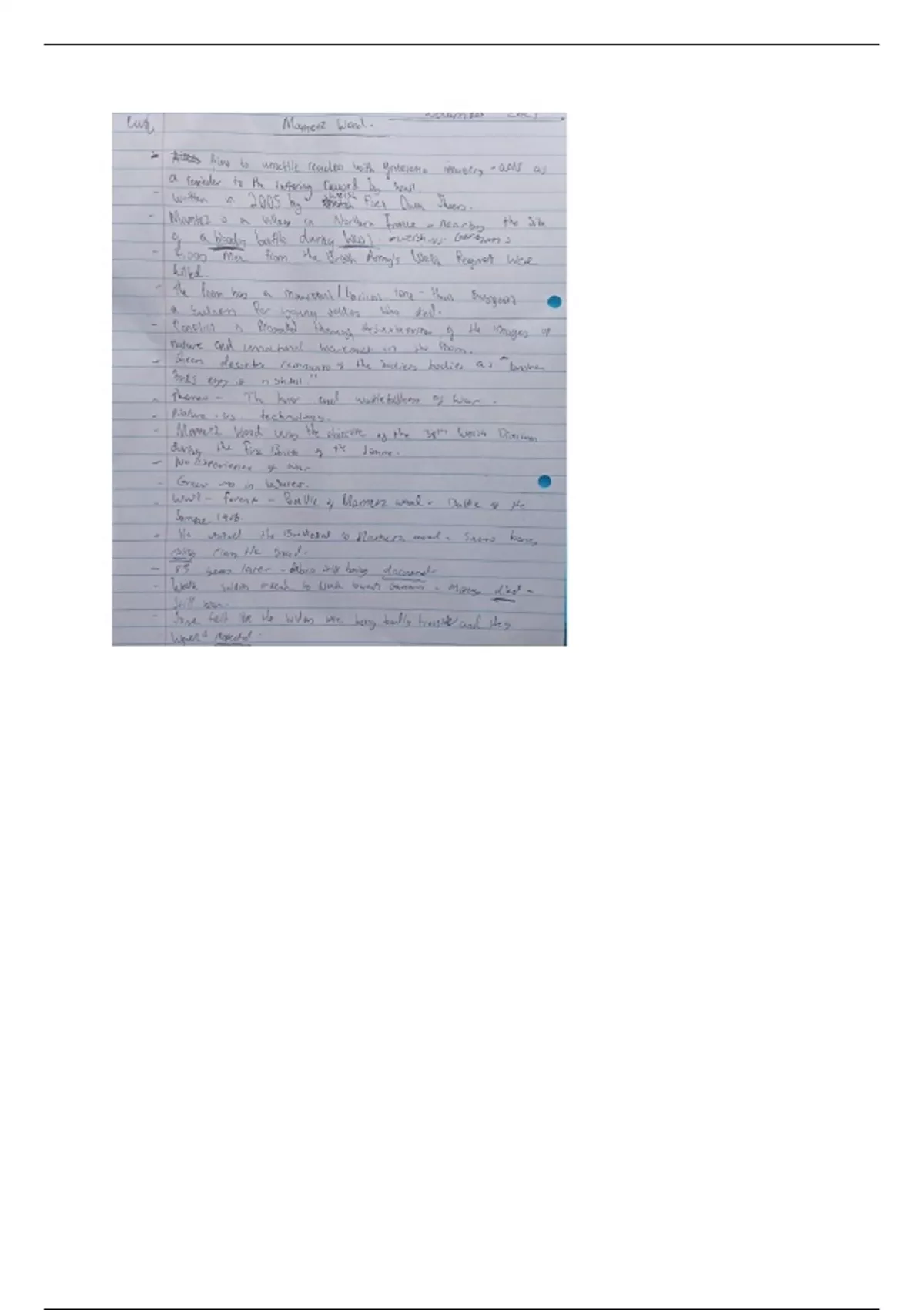 A page of notes about the eduqas poem Mametz Wood by Welsh poet Owen Sheers. The notes are at GCSE level and are used in the Eduqas English Literature Paper 1