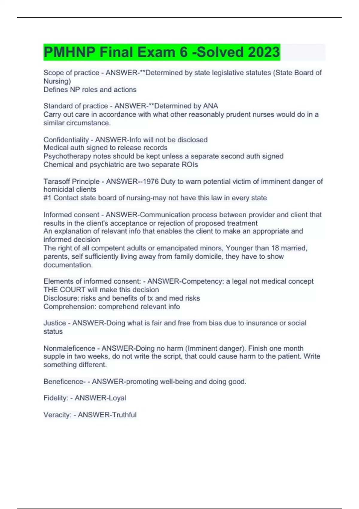 Scope of practice - ANSWER-**Determined by state legislative statutes (State Board of Nursing) Defines NP roles and actions Standard of practice - ANSWER-**Determined by ANA Carry out care in accordance with what other reasonably prudent nurses would do in a similar circumstance. Confidentiality - ANSWER-Info will not be disclosed Medical auth signed to release records Psychotherapy notes should be kept unless a separate second auth signed Chemical and psychiatric are two separate ROIs Tarasoff Principle - ANSWER--1976 Duty to warn potential victim of imminent danger of homicidal clients #1 Contact state board of nursing-may not have this law in every state Informed consent - ANSWER-Communication process between provider and client that results in the client's acceptance or rejection of proposed treatment An explanation of relevant info that enables the client to make an appropriate and informed decision The right of all competent adults or emancipated minors, Younger than 18 married, parents, self sufficiently living away from family domicile, they have to show documentation. Elements of informed consent: - ANSWER-Competency: a legal not medical concept THE COURT will make this decision Disclosure: risks and benefits of tx and med risks Comprehension: comprehend relevant info Justice - ANSWER-Doing what is fair and free from bias due to insurance or social status Nonmaleficence - ANSWER-Doing no harm (Imminent danger). Finish one month supple in two weeks, do not write the script, that could cause harm to the patient. Write something different. Beneficence- - ANSWER-promoting well-being and doing good. Fidelity: - ANSWER-Loyal Veracity: - ANSWER-Truthful Autonomy- - ANSWER-doing for self-they can accept or refuse life sustaining treatment Respect: - ANSWER-Treating everyone equally Case management: - ANSWER-A system of OVERSIGHT and authorization of SERVICES and benefits provided to clients consisting of coordination care ensuring quality outcomes, monitoring plan of care and advocacy Overall goal is to promote quality and cost effective outcomes Working as a case manager for clients with severe mental health, Maintains in depth and accurate client records: - ANSWER-THE TREATMENT PLANS Research - ANSWER-P- Pt population, Problem I- Intervention C- Comparison to other tx O- Outcome T- Time Level I- - ANSWER-Evidence from a system review or meta analysis of 3 or more Level II- - ANSWER-Evidence obtained from at least one well designed RCT (LARGE MULTI SITE RCT) Recovery model - ANSWER-Focus in future, foster their abilities interests and dreams Does not focus on the illness It is self-directed They choose the plan Four dimensions of Recovery - ANSWER-Health Home Purpose Community Evidence based practice guidelines: - ANSWER-Client's ethnicity and culture Accessing current journals Client goal directed Effective management of illness Start thinking of cultural questions when they mention it in the scenario: always RESPECT Cultural illness: is not mental illness, Brief supportive therapy can be offered, may not need medication Assertive Community Treatment ACT - ANSWER-Community health service delivery Mental health services in the community setting rather than more restrictive hospital setting to those with serious mental illness Primary goal: decrease reliance on hospitals
