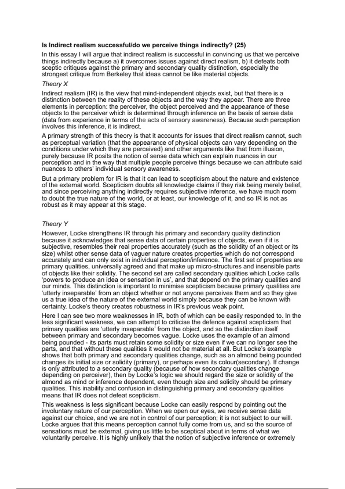 A*/A fully written Indirect Realism essay for AQA Philosophy A-level.