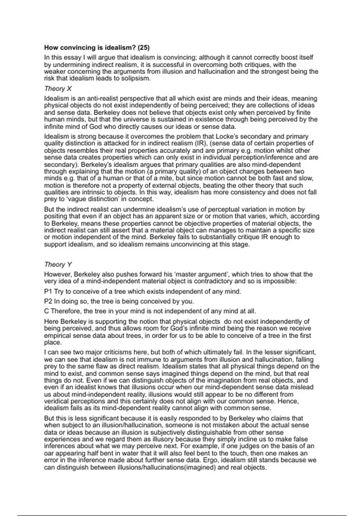 A*/A fully written idealism essay for AQA Philosophy A-level.