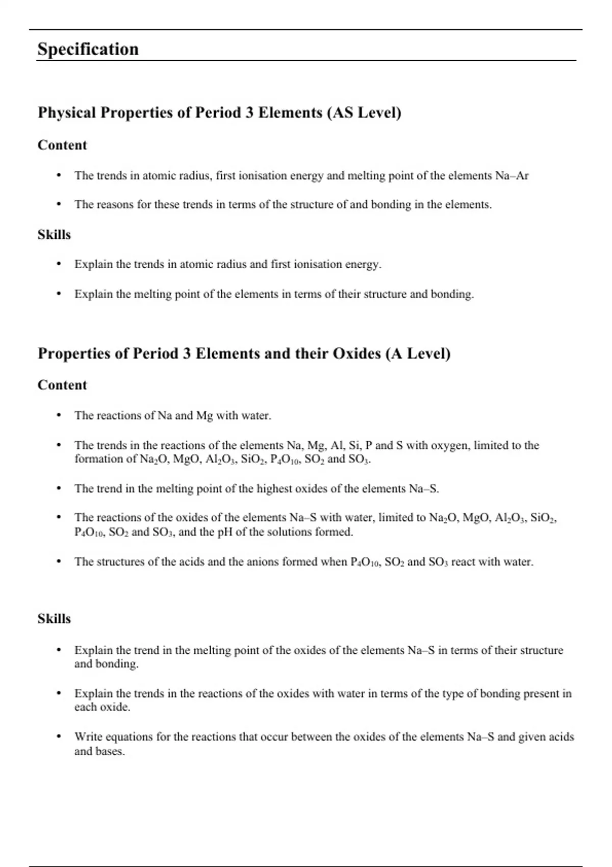 • The trends in the reactions of the elements Na, Mg, Al, Si, P and S with oxygen, limited to the