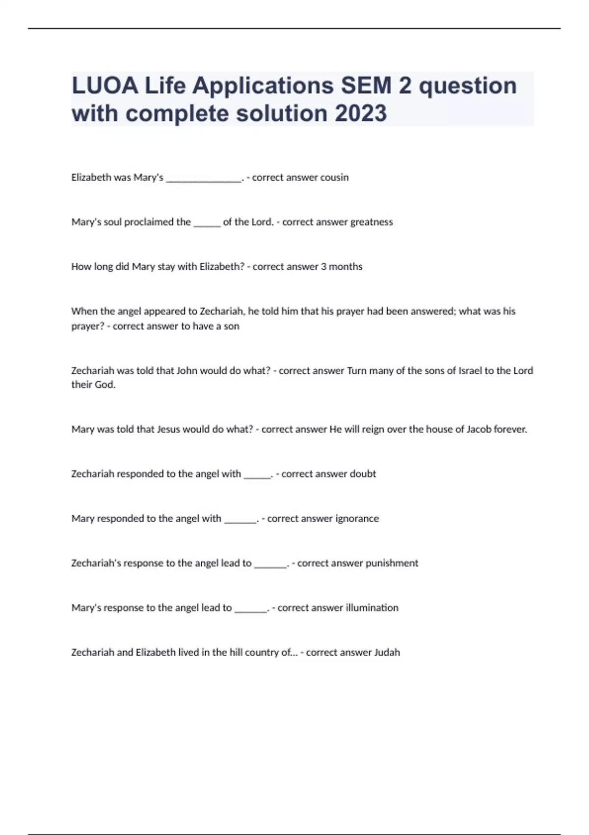 LUOA Life Applications SEM 2 question with complete solution 2023Elizabeth was Mary's ______________. - correct answer cousin Mary's soul proclaimed the _____ of the Lord. - correct answer greatness How long did Mary stay with Elizabeth? - correct answer 3 months When the angel appeared to Zechariah, he told him that his prayer had been answered; what was his prayer? - correct answer to have a son Zechariah was told that John would do what? - correct answer Turn many of the sons of Israel to the Lord their God. Mary was told that Jesus would do what? - correct answer He will reign over the house of Jacob forever. Zechariah responded to the angel with _____. - correct answer doubt Mary responded to the angel with ______. - correct answer ignorance Zechariah's response to the angel lead to ______. - correct answer punishment Mary's response to the angel lead to ______. - correct answer illumination Zechariah and Elizabeth lived in the hill country of... - correct answer Judah