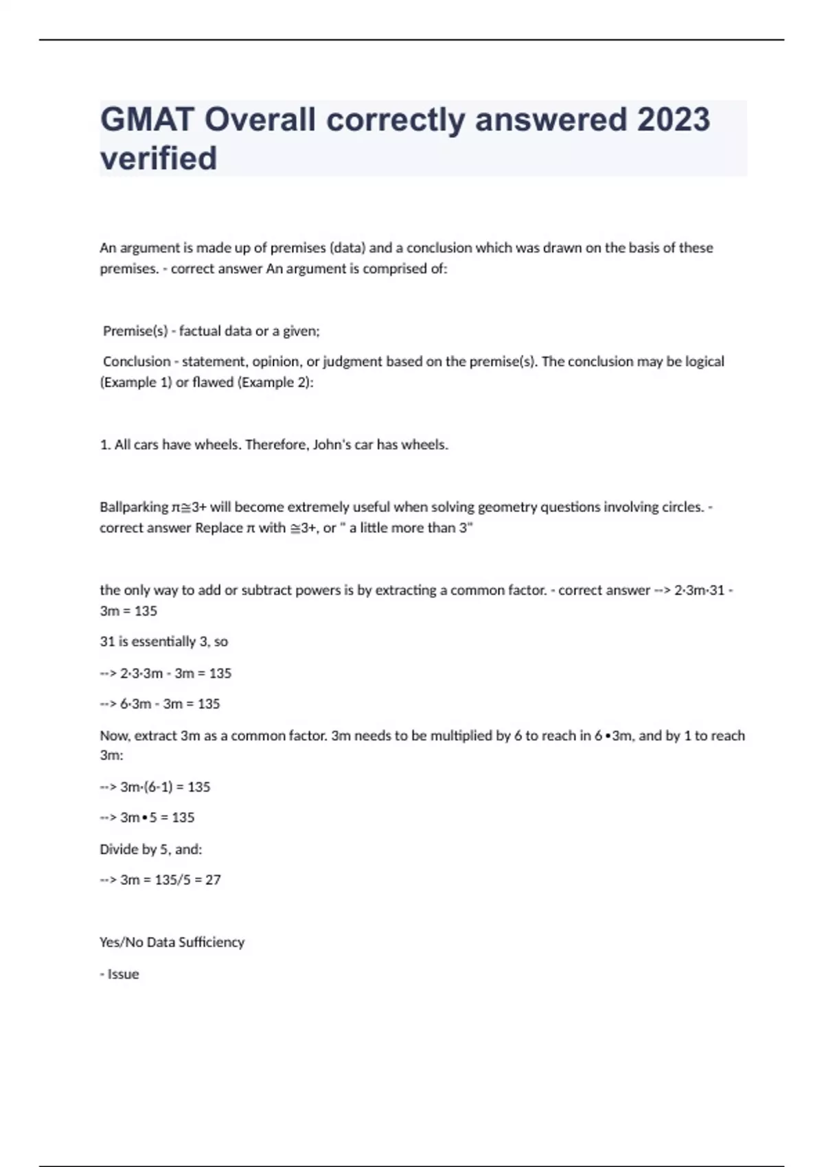 GMAT Overall correctly answered 2023 verified An argument is made up of premises (data) and a conclusion which was drawn on the basis of these premises. - correct answer An argument is comprised of: Premise(s) - factual data or a given; Conclusion - statement, opinion, or judgment based on the premise(s). The conclusion may be logical (Example 1) or flawed (Example 2): 1. All cars have wheels. Therefore, John's car has wheels. Ballparking π≅3+ will become extremely useful when solving geometry questions involving circles. - correct answer Replace π with ≅3+, or " a little more than 3" the only way to add or subtract powers is by extracting a common factor. - correct answer -- 2·3m·31 - 3m = 135 31 is essentially 3, so -- 2·3·3m - 3m = 135 -- 6·3m - 3m = 135 Now, extract 3m as a common factor. 3m needs to be multiplied by 6 to reach in 6∙3m, and by 1 to reach 3m: -- 3m·(6-1) = 135 -- 3m∙5 = 135 Divide by 5, and: -- 3m = 135/5 = 27 Yes/No Data Sufficiency - Issue - Plug In