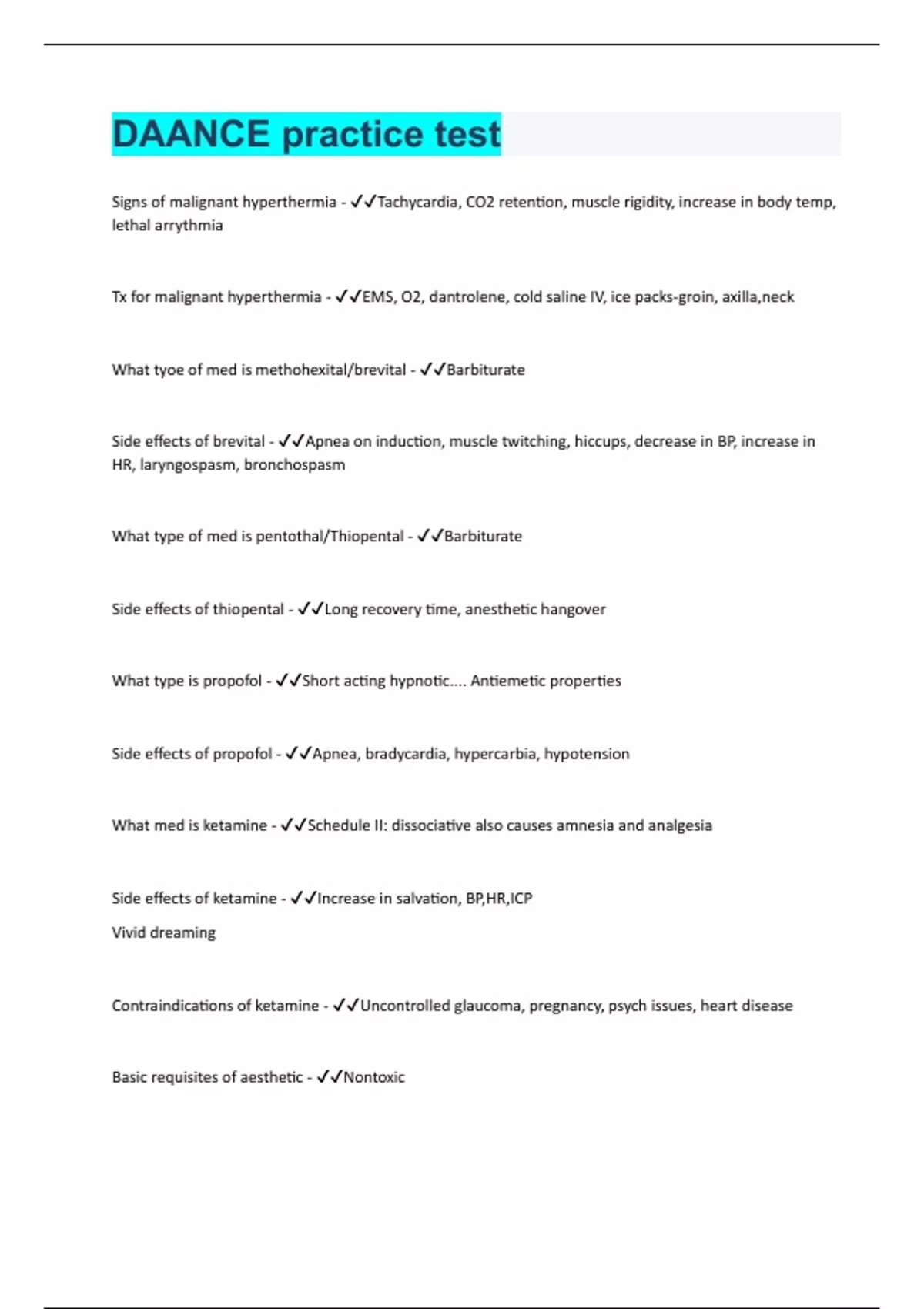 Signs of malignant hyperthermia - Tachycardia, CO2 retention, muscle rigidity, increase in body temp, lethal arrythmia Tx for malignant hyperthermia - EMS, O2, dantrolene, cold saline IV, ice packs-groin, axilla,neck What tyoe of med is methohexital/brevital - Barbiturate Side effects of brevital - Apnea on induction, muscle twitching, hiccups, decrease in BP, increase in HR, laryngospasm, bronchospasm What type of med is pentothal/Thiopental - Barbiturate Side effects of thiopental - Long recovery time, anesthetic hangover What type is propofol - Short acting hypnotic.... Antiemetic properties Side effects of propofol - Apnea, bradycardia, hypercarbia, hypotension What med is ketamine - Schedule II: dissociative also causes amnesia and analgesia Side effects of ketamine - Increase in salvation, BP,HR,ICP Vivid dreaming Contraindications of ketamine - Uncontrolled glaucoma, pregnancy, psych issues, heart disease Basic requisites of aesthetic - Nontoxic