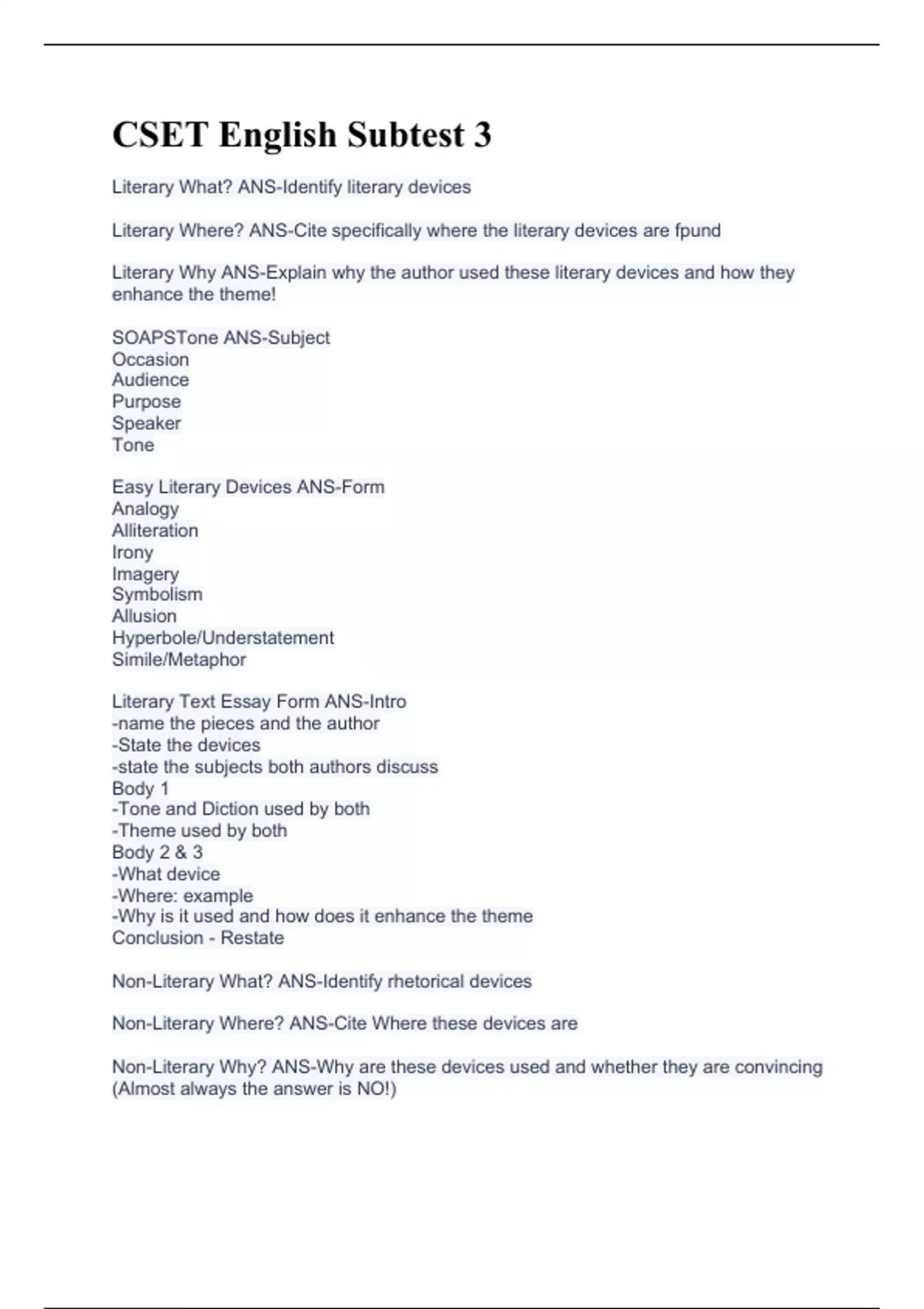 CSET English Subtest 3 Literary What? ANS-Identify literary devices Literary Where? ANS-Cite specifically where the literary devices are fpund Literary Why ANS-Explain why the author used these literary devices and how they enhance the theme! SOAPSTone ANS-Subject Occasion Audience Purpose Speaker Tone Easy Literary Devices ANS-Form Analogy Alliteration Irony Imagery Symbolism Allusion Hyperbole/Understatement Simile/Metaphor